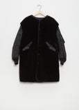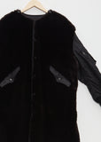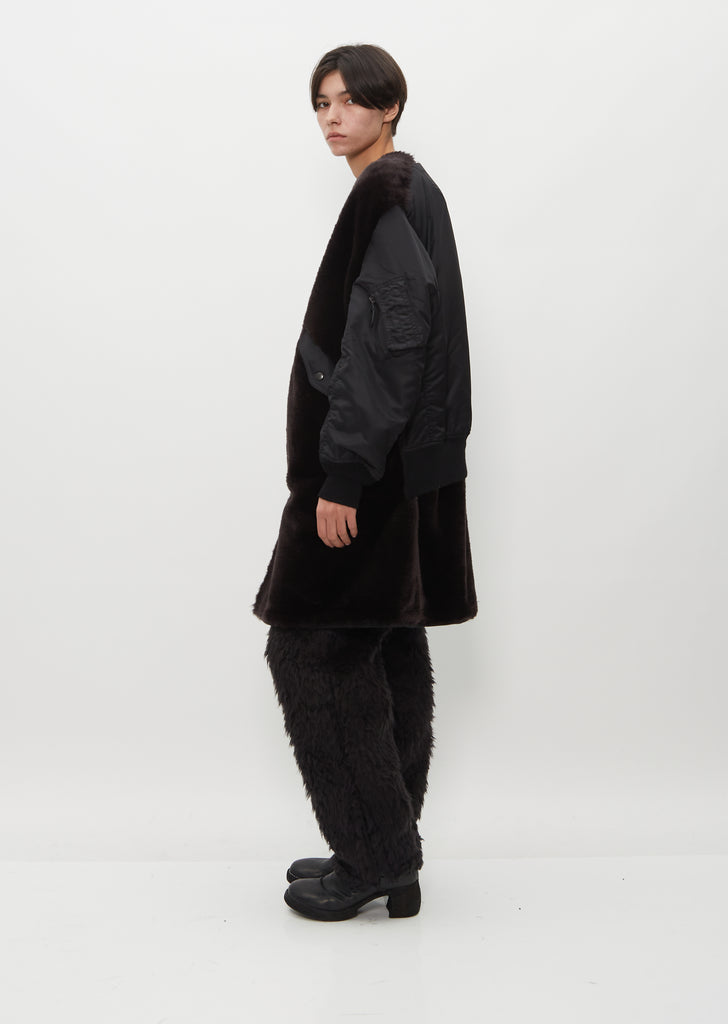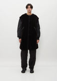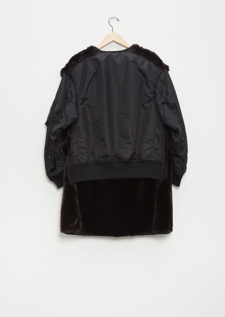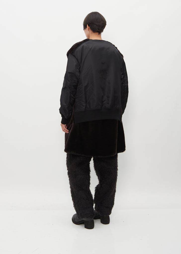 Junya Watanabe black single breasted coat with faux fur body and bomber overlay in smooth technical fabric. Features welt flap snap pockets, single zip pocket on sleeve and concealed tonal button front closure.