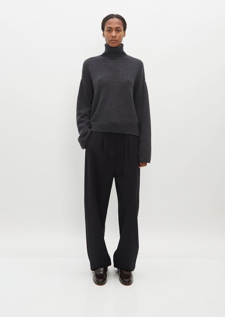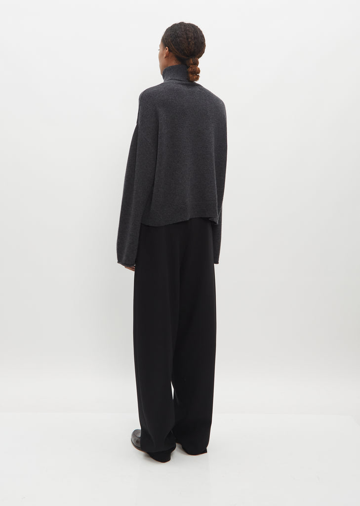 La Collection dark gey slightly cropped sweater with a fold-over turtleneck and wide, extended sleeves with rolled edges in cashmere knit. Features dropped shoulders and rib trim finish at hem. Boxy silhouette with a relaxed fit.
