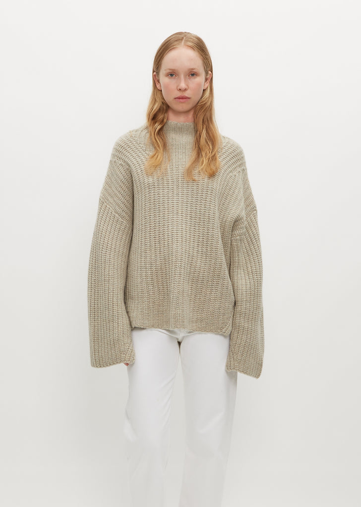 Loulou Studio geo melange sweater with an oversized silhouette knit in pure cashmere. Features a short funnel neck, extra long slightly flared sleeves, side splits, and a slightly longer back hem.