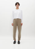 Lauren Manoogian dark beige pants with a tapered leg and elasticized waist in a merino wool and baby alpaca blend knit. Features ribbed trim cuffs. Pull on fit.
