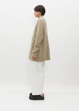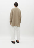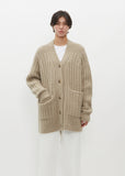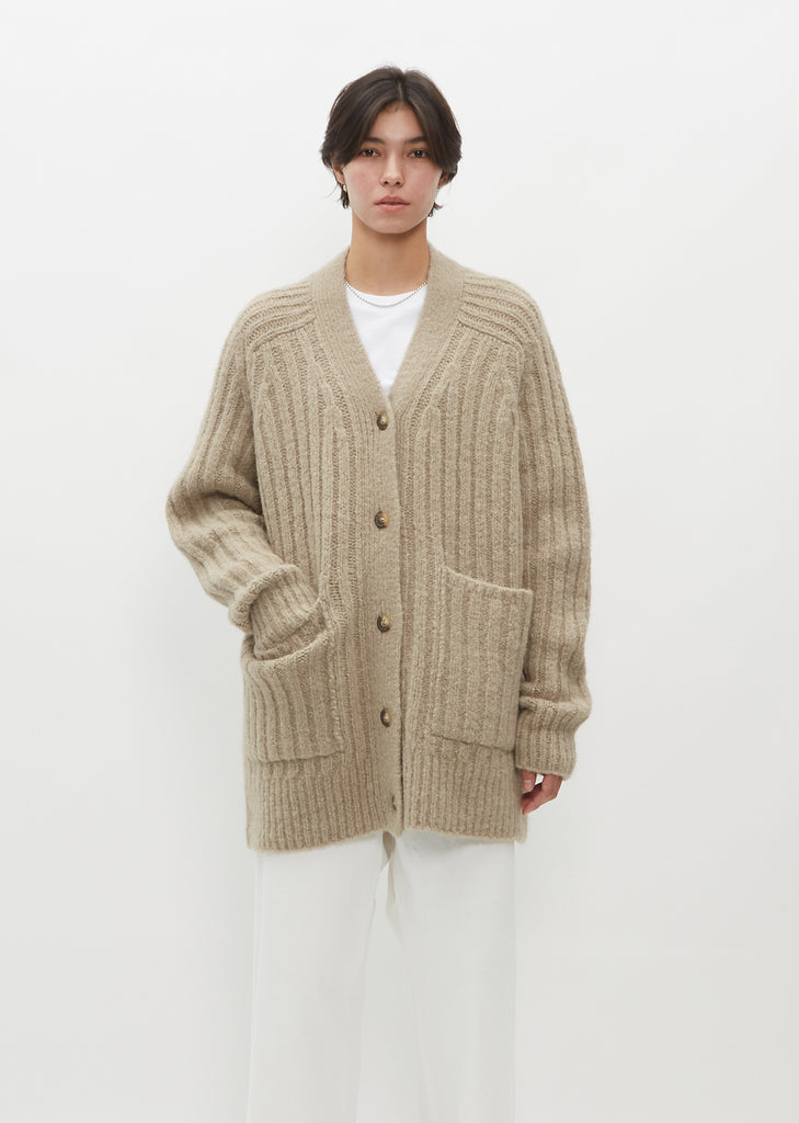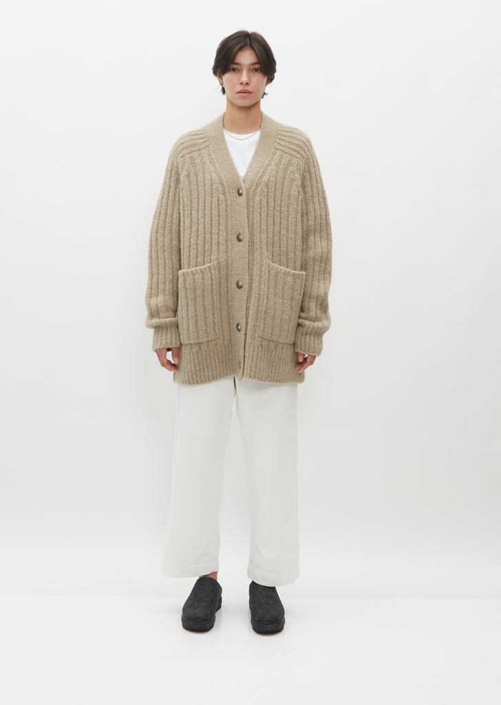 Lauren Manoogian beige cardigan with a v-neckline and ribbed saddle shoulders in a babu alpaca and merino wool blend. Features hip patch pockets, finely ribbed placket and rib trim finish along the neck, cuff and hem.