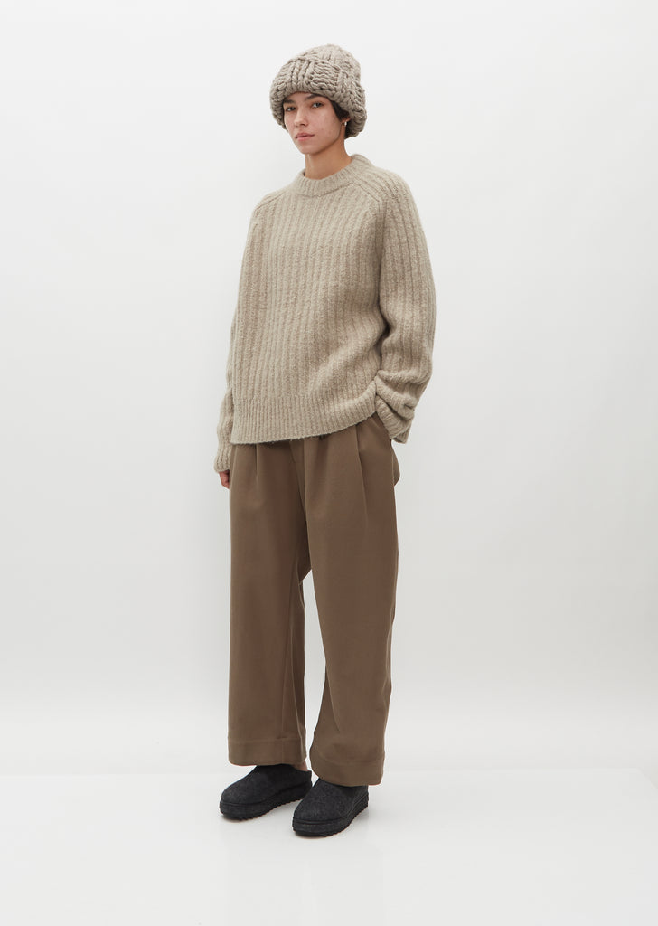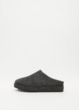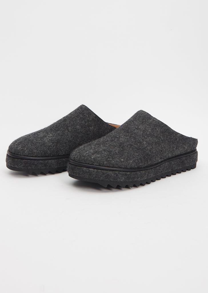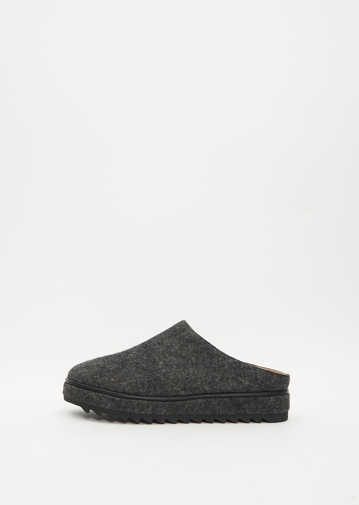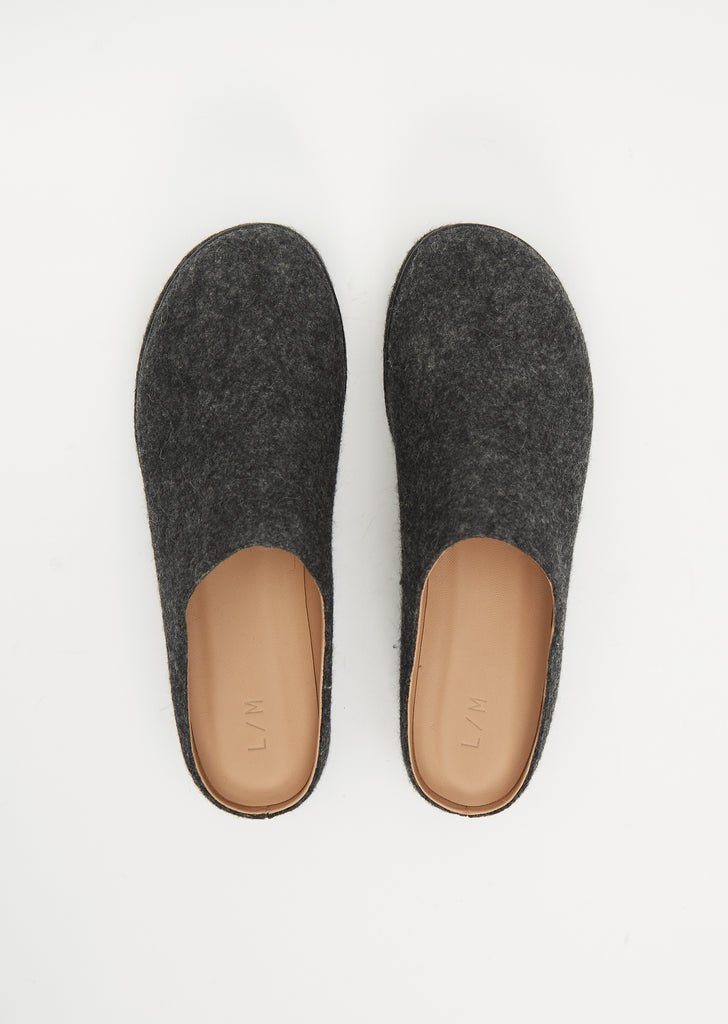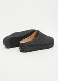 Lauren Manoogian charcoal slip on mule with a rounded toe in wool felt. Fully lined in contrast beige leather and grounded by a tonal treaded sole with tonal felt wrapped midsole.