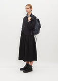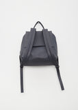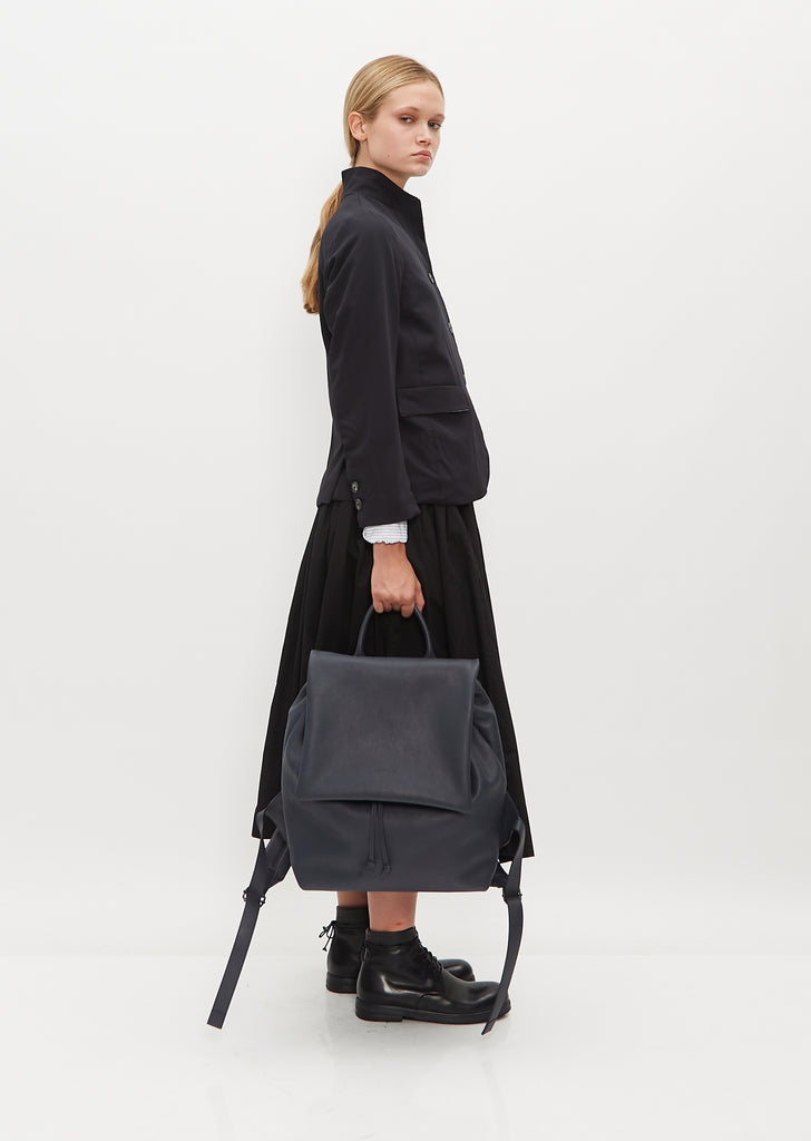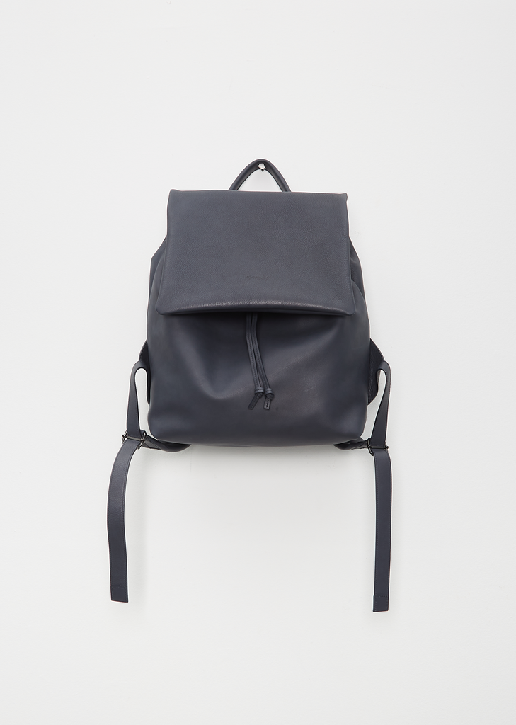 Marsèll midnight blue backpack with a square fold over top with drawstring closure in smooth leather. Features a tonal leather top handle and padded adjustable shoulder straps. Lined in tonal fine grained leather and a single zippered pocket.