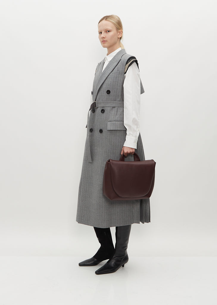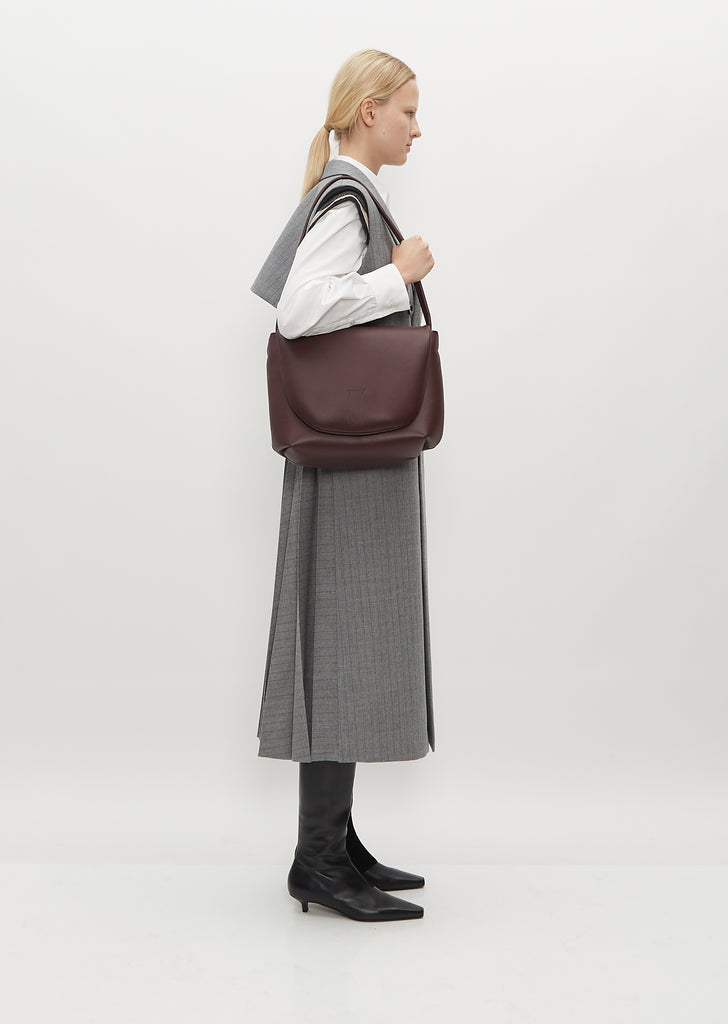 Marsèll rich burgundy top handle bag with a large fold over face with rounded edges in grained calf leather. Fitted with a slip pocket and zippered pocket. Can be worn using optional adjustable flat shoulder strap.