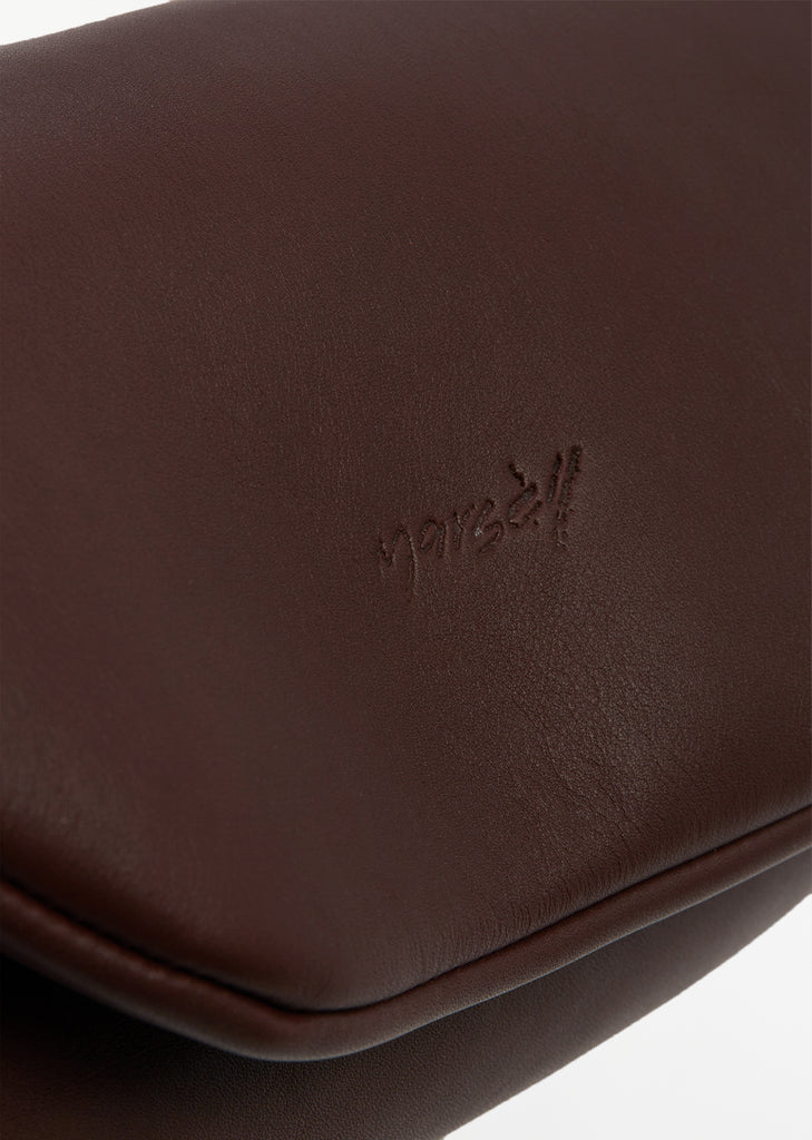 Marsèll rich burgundy small bag with a rounded fold over face and a thin shoulder strap handcrafted in smooth fine grained calf leather. Fitted with a single interior slip pocket.