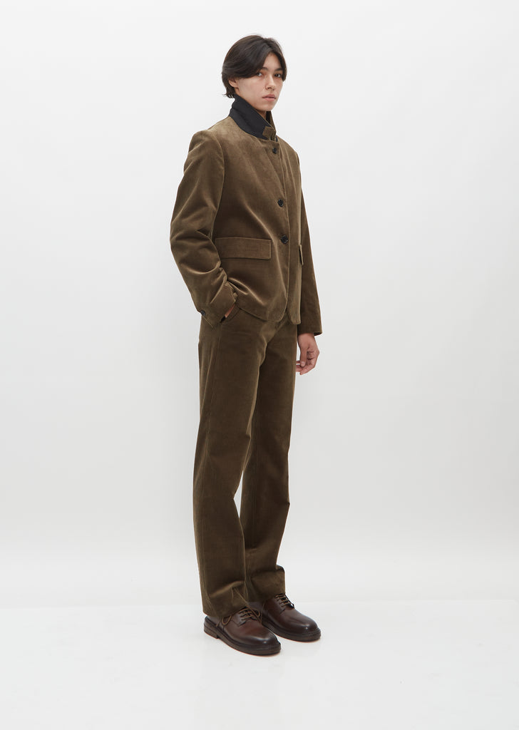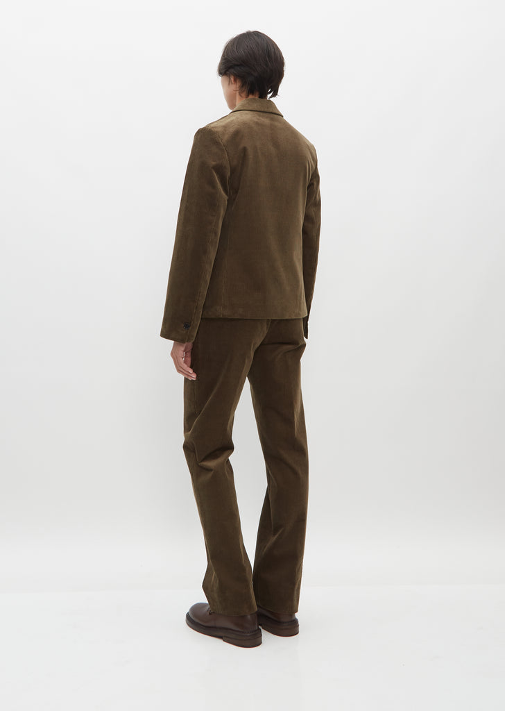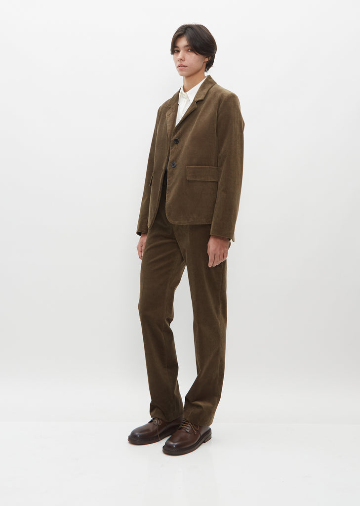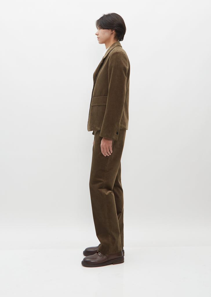 Margaret Howell light olive single breasted blazer in cotton corduroy. Features flap pockets, a hanger loop in back neck, a button fastening lapel, button detail in cuffs and cotton lining. Cropped relaxed fit.
