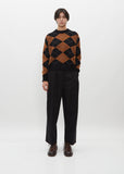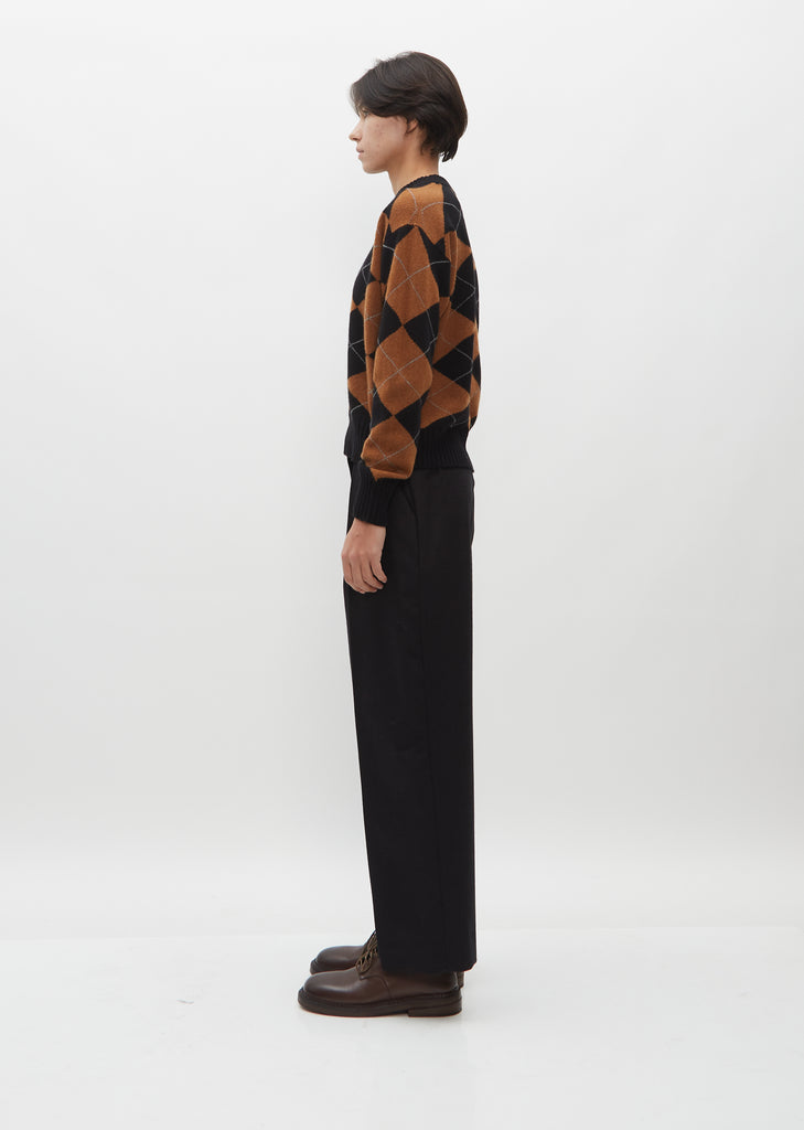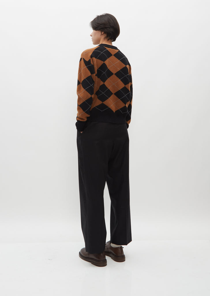 Margaret Howell black and tan oversized argyle printed sweater with a wide, relaxed fit knit in merino wool and cashmere. Finished with black wide ribbed trim finish along the neck, cuff and hem.