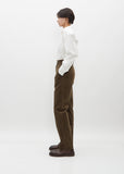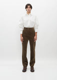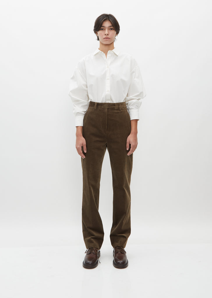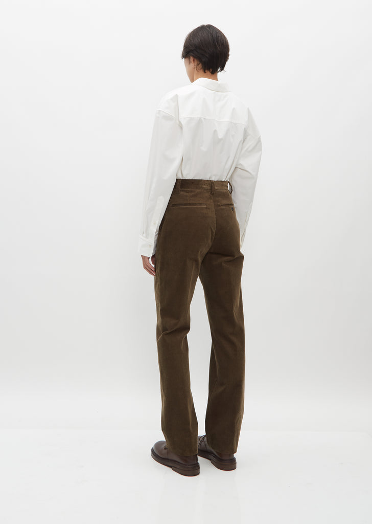 Margaret Howell light olive tapered trouser with regular cut in cotton corduroy. Features slant pockets, belt loops, welt back pocket and welt and button back pocket. Finished with a zip fly and extended waist tab concealed hook and eye closure.