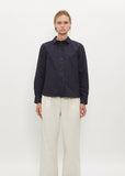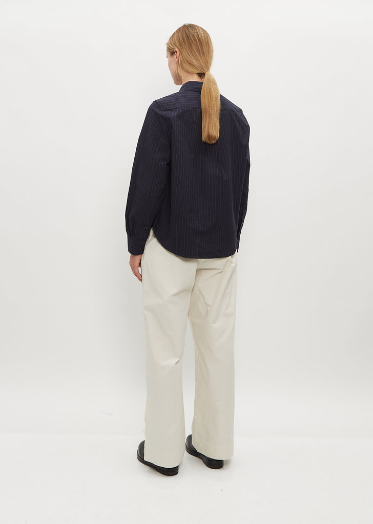 MHL by Margaret Howell navy and grey button down shirt in medium weight dry cotton poplin with a crisp, paper-like hand. Features a tab collar, wrist-length sleeves and contrast buttons. Boxy, cropped fit.