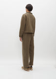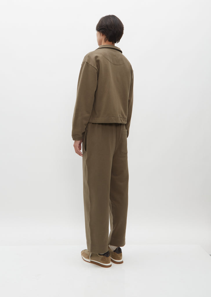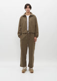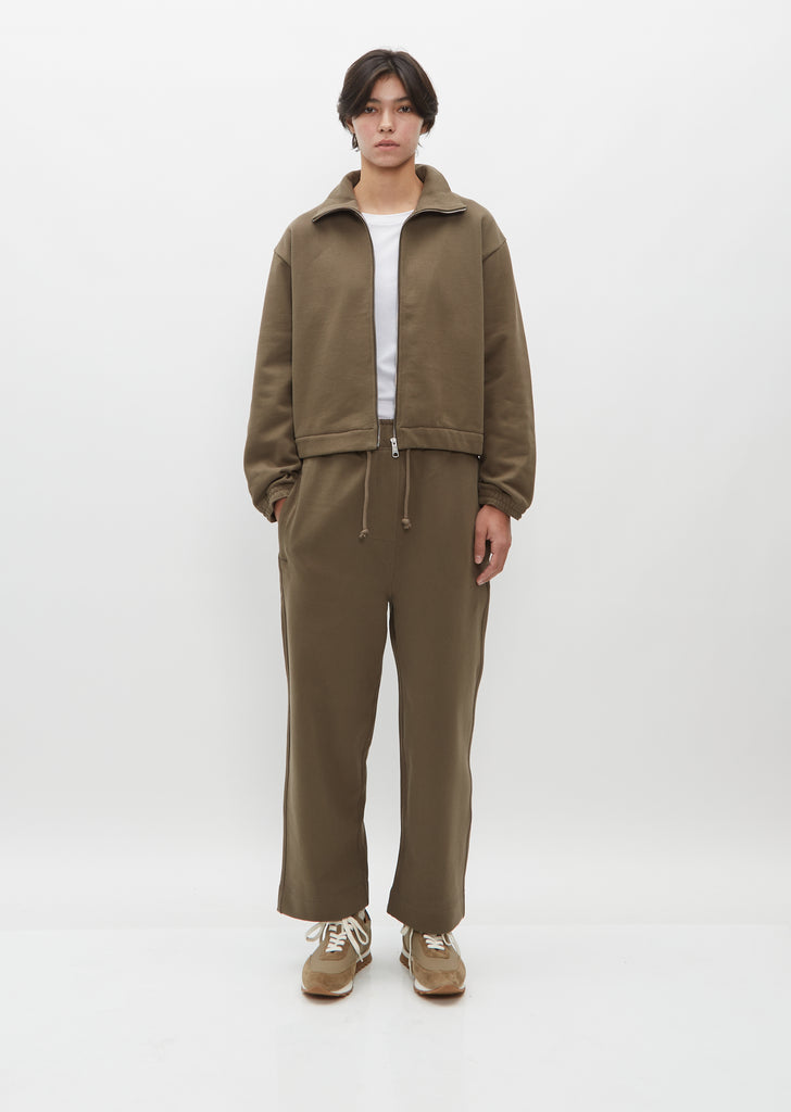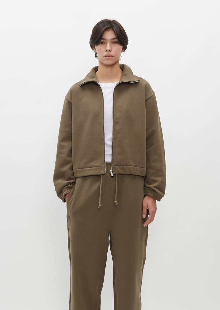 MHL By Margaret Howell olive track style top with high neck and boxy fit in loopback organic cotton jersey. Features welt seam side pockets, tonal drawstring hem and elasticized cuffs. Finished with hanger loop in back of neck with a contrast cotton half moon detailing.
