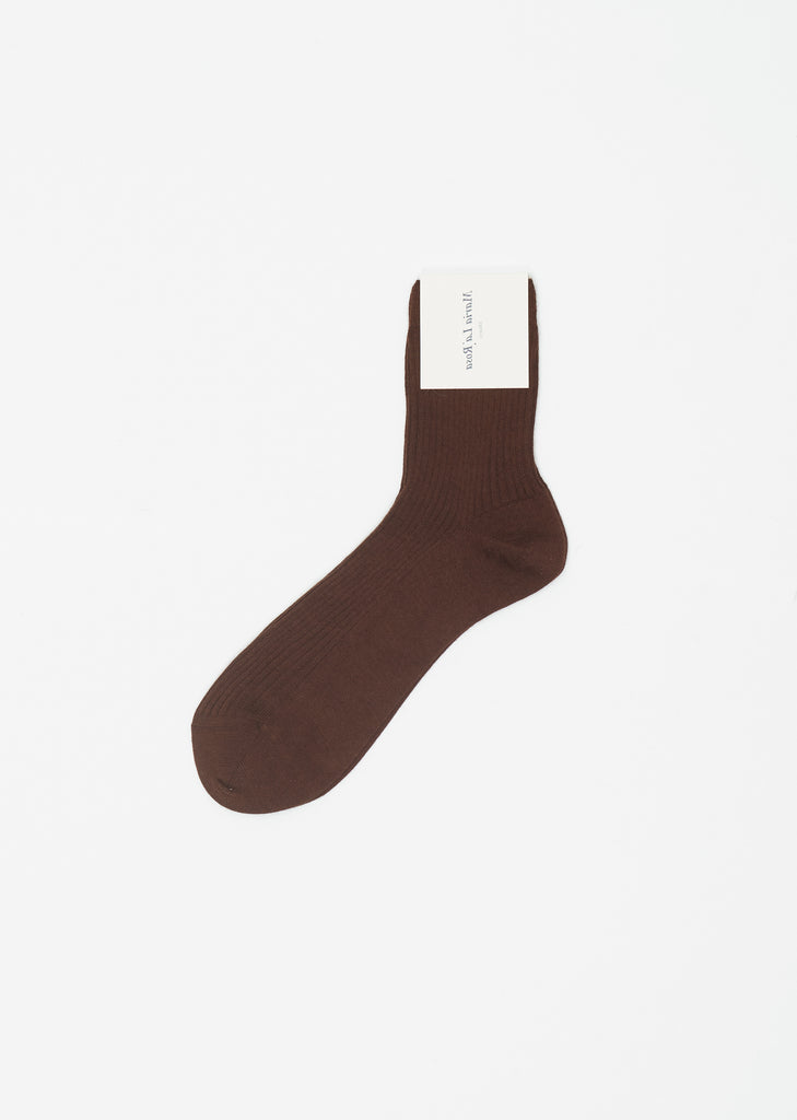 Maria La Rosa chocolate ankle socks in a soft cashmere, merino wool and silk blend ribbed knit with reinforced toe, heel, and top.