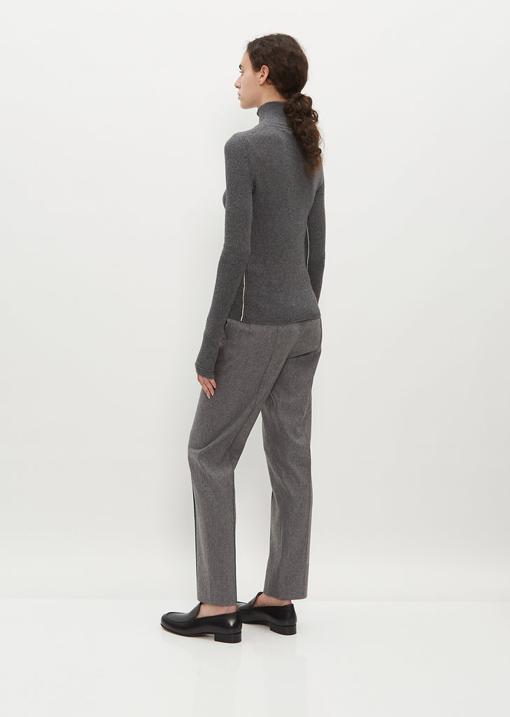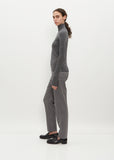 Maria McManus charcoal grey close fitting turtleneck top in recycled cashmere and organic cotton. Features fine ribbing on sleeves and finished with ribbed trim along neck, hem and cuff.