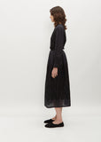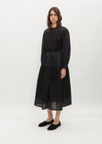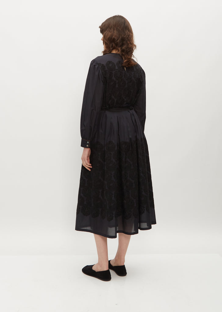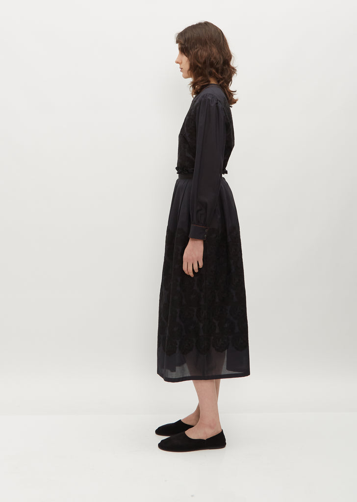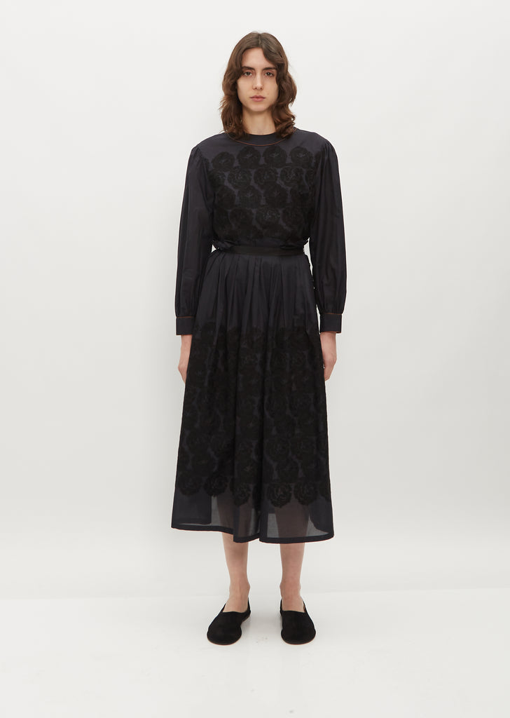 Minä Perhonen dark navy mid length pleated skirt with an A-line silhouette in a cotton silk detailed with floral embroidery. Features a pleated waistband and side button closure. This skirt is unlined.