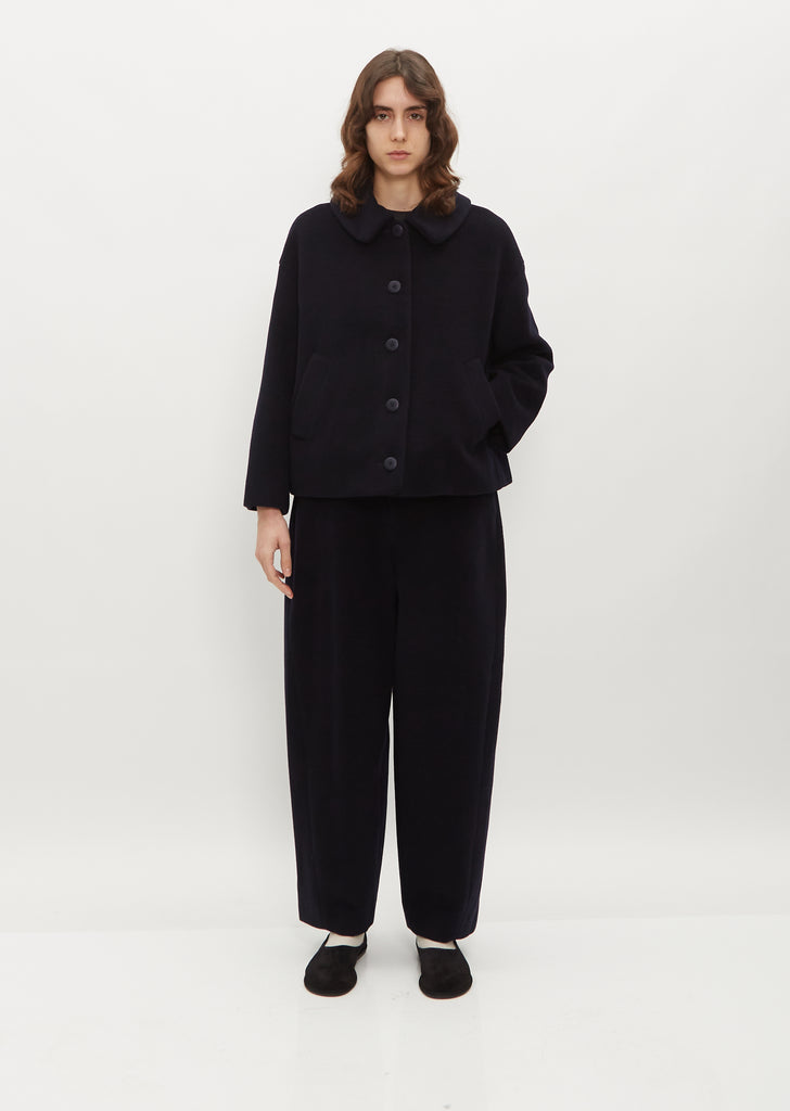 Minä Perhonen navy jacket with a rounded spread collar in a wool cashmere blend. Features welt seam side pockets, dropped shoulders, single button back vent and tonal buttons. This jacket is fully lined.