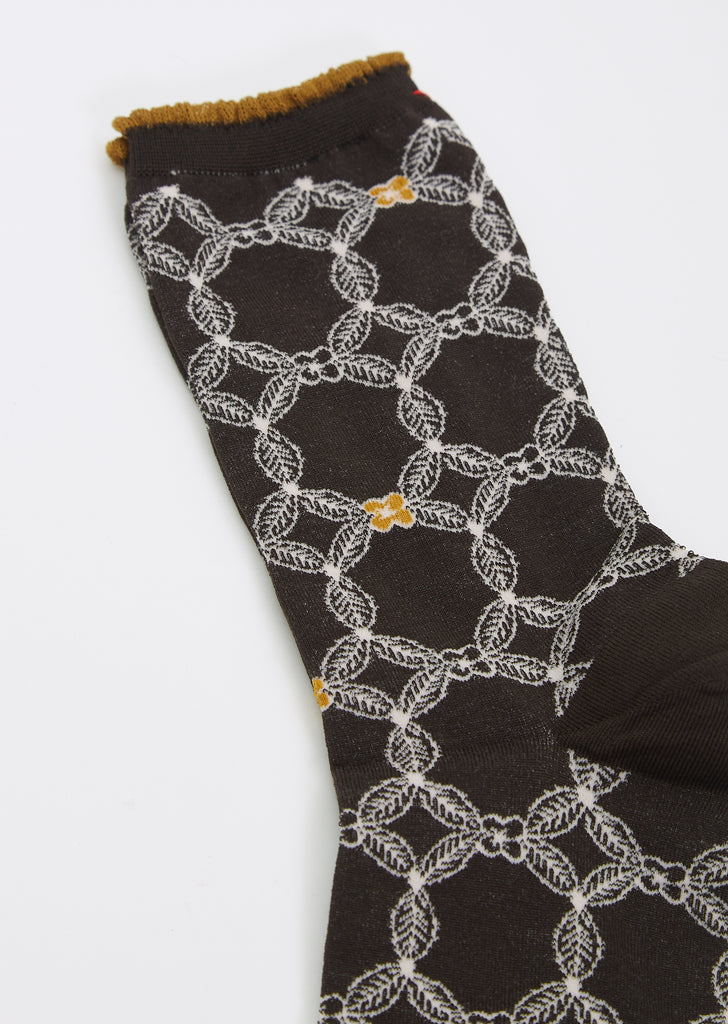 Minä Perhonen brown crew socks with white floral linked motif and contrast bronze ruffle opening knit in a fine cotton blend.