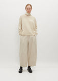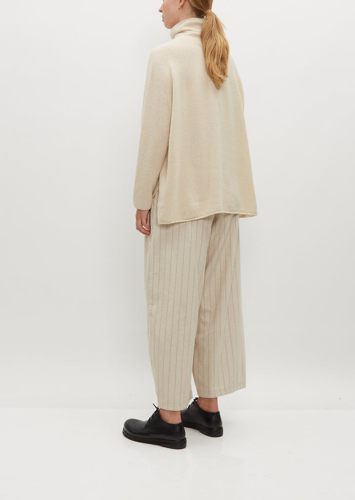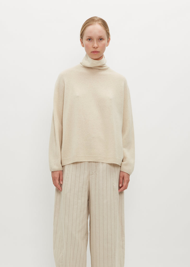 Pas de Calais ivory relaxed sweater with a loose fitting turtle neck in fine Australian merino wool. Features a short front hem with ribbed trim finish, longer back hem, and side splits.