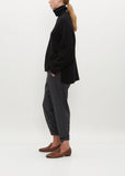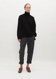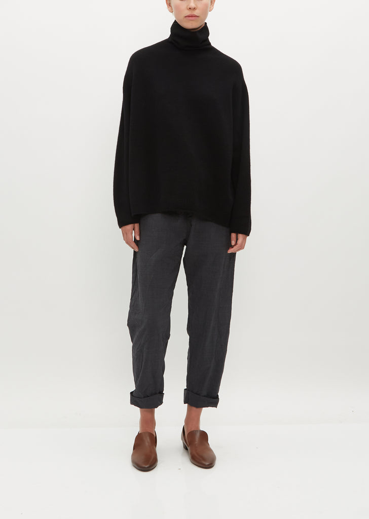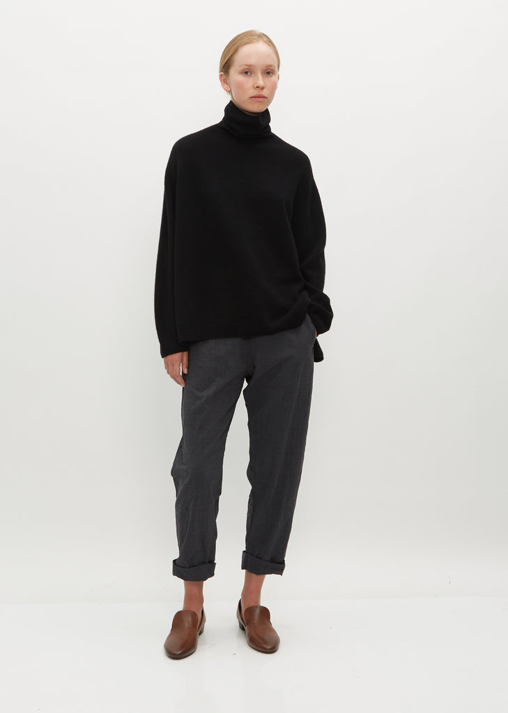 Pas de Calais black relaxed sweater with a loose fitting turtle neck in fine Australian merino wool. Features a short front hem with ribbed trim finish, longer back hem, and side splits.