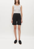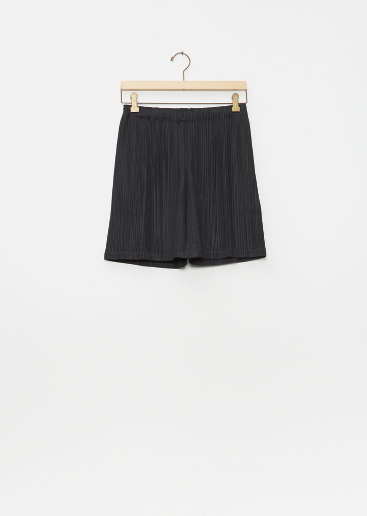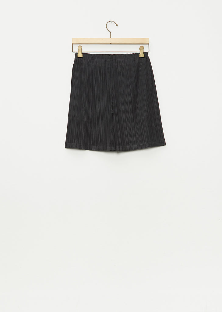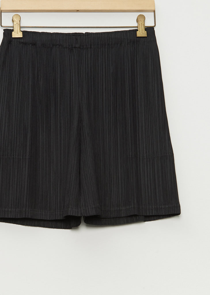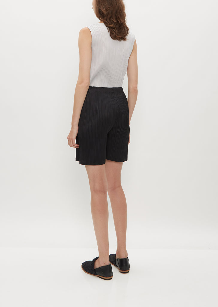 Pleats Please black knee length shorts with an elasticized waist in pleated technical chiffon. Pull on fit.