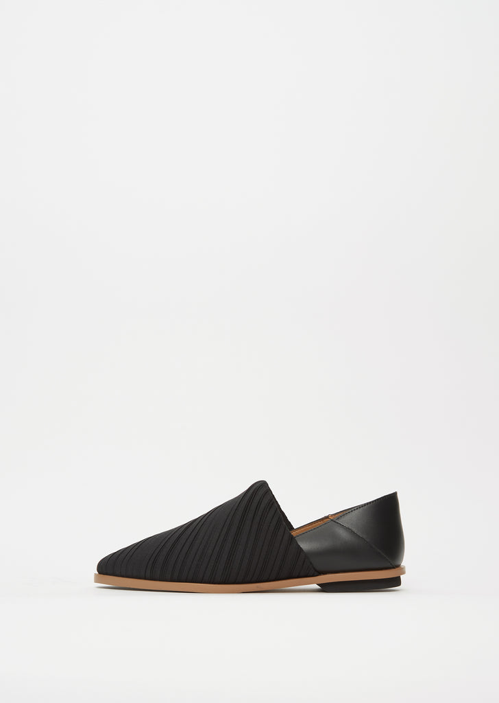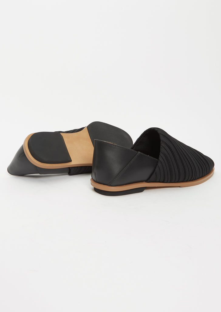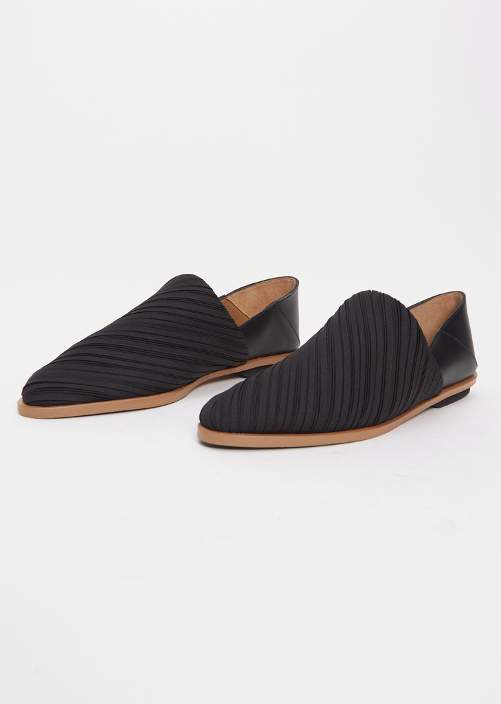Pleats Please black slip on flat with finely pleated upper and an oblique toe in satin. Fully lined in leather, set on a treaded rubber sole. Can be worn with backside folded in.