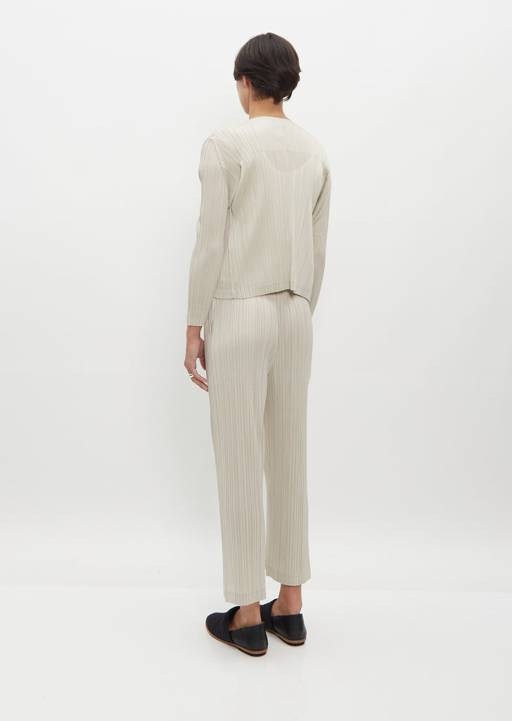 Pleats Please greige cropped, straight leg pants with an elasticized waist and side seam pockets in pleated technical chiffon. Pull on fit.