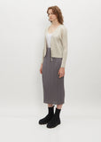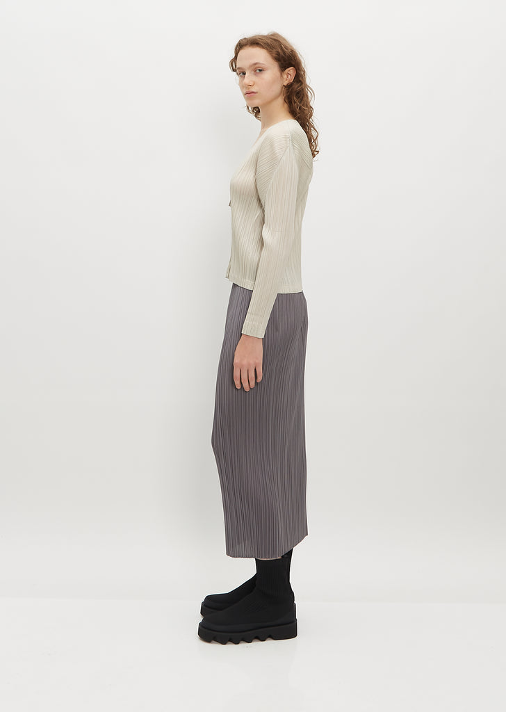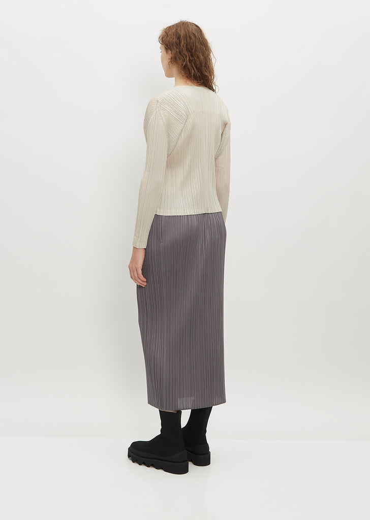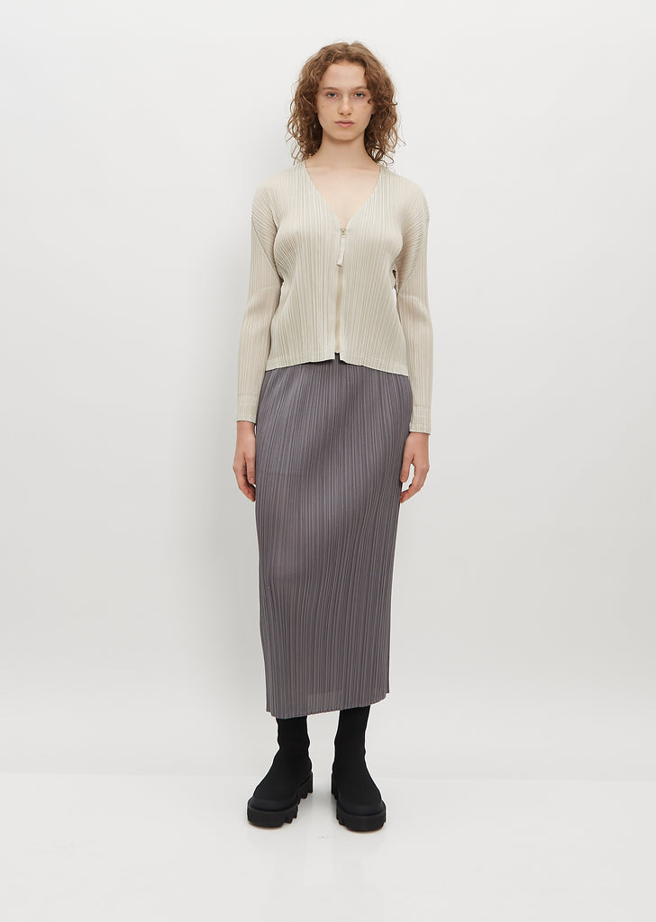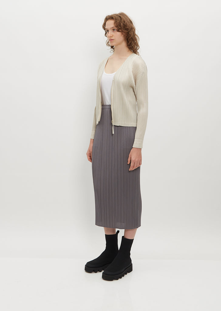 Pleats Please grey mid length pencil skirt with an elasticized waist in pleated technical chiffon. Pull on fit.
