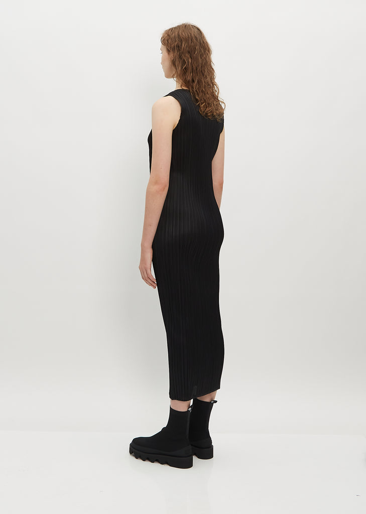 Pleats Please black mid length sleeveless dress with a round neckline in pleated technical chiffon.