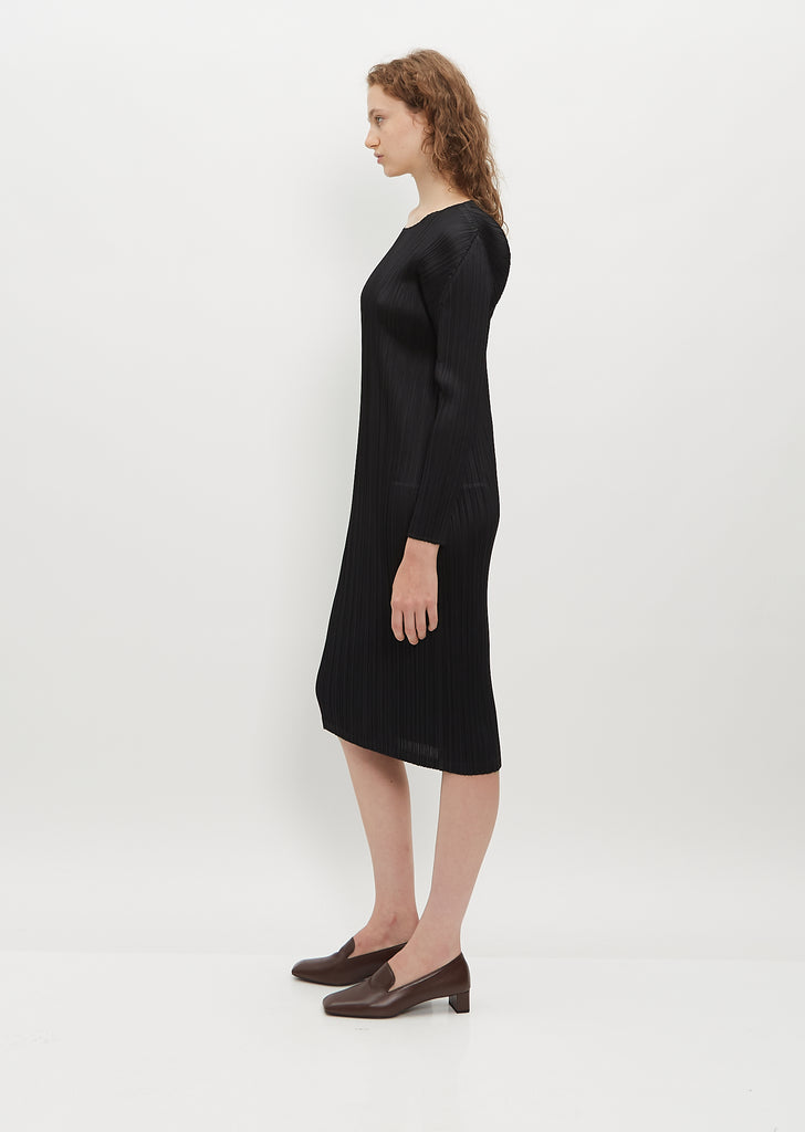 Pleats Please black mid length long sleeve dress with a round neckline in pleated technical chiffon.