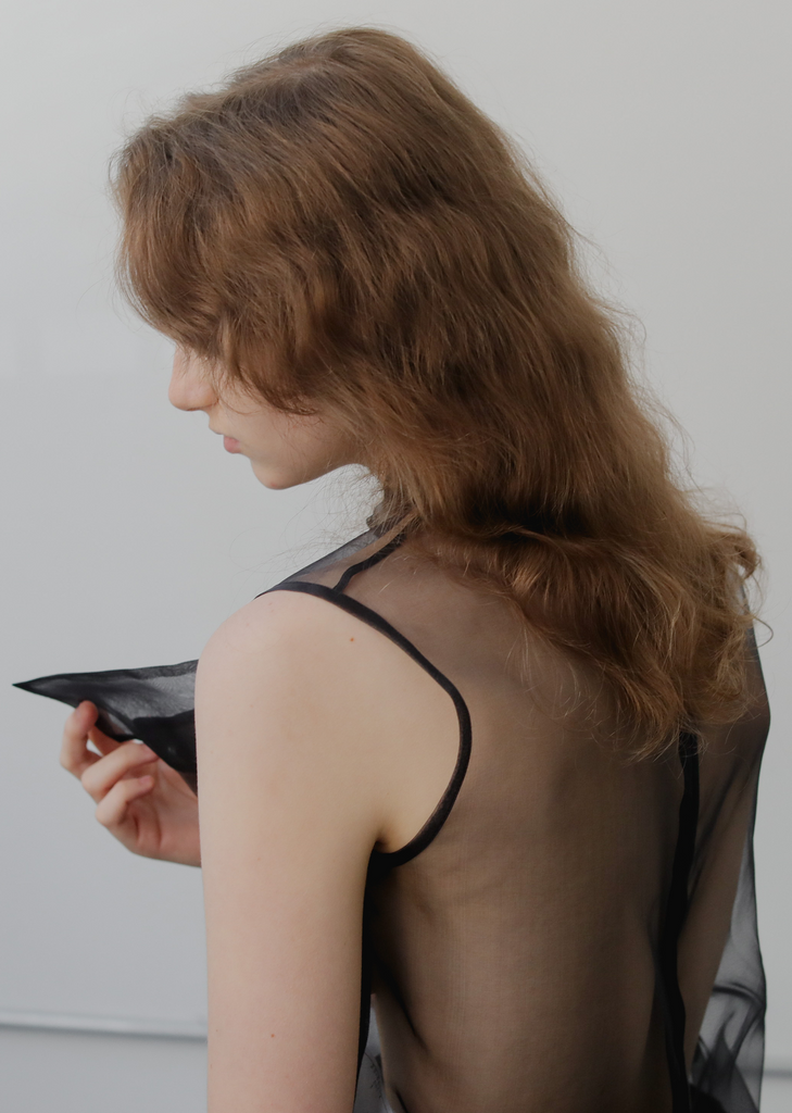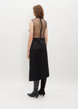Sacai black sleeveless top with an attached folded neck scarf in sheer silk organdy. Features a short mock neckline, side slits, and a concealed back zip.