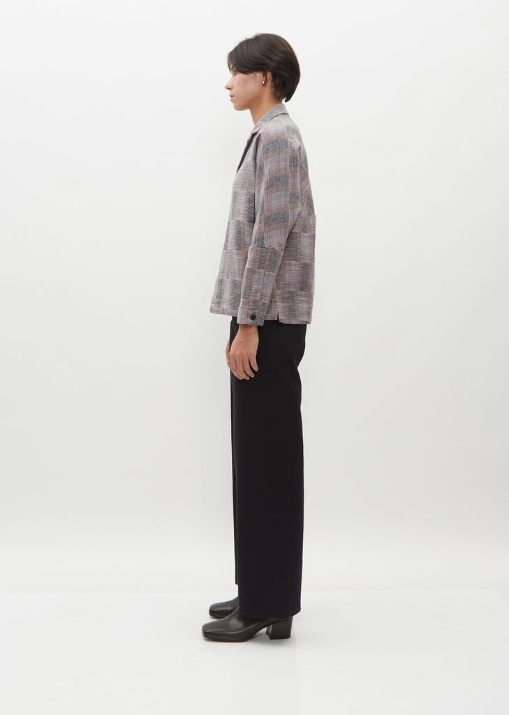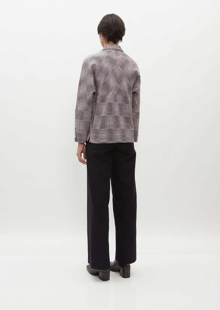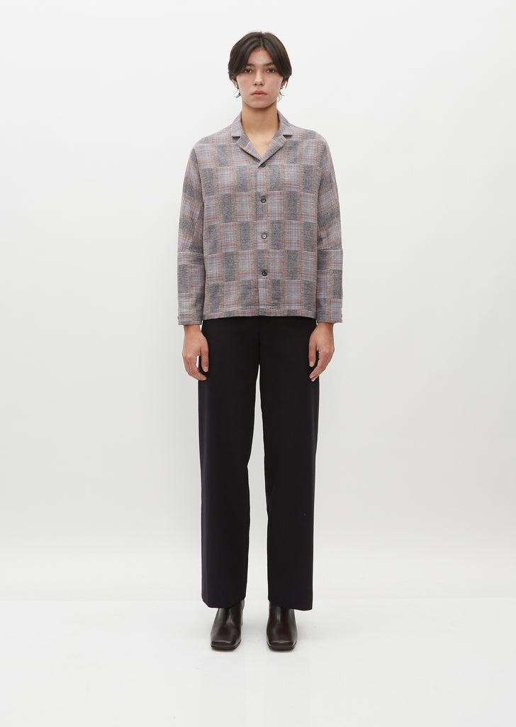 Stephan Schneider relaxed and boxy overshirt cut from a double faced super soft cotton patterned with vertical plaid pattern of poppy red, stone and blue  from the brand’s fabric archive. Features a narrow camp collar, seamless shoulder construction, side splits and center back seam. Finished with natural horn buttons.