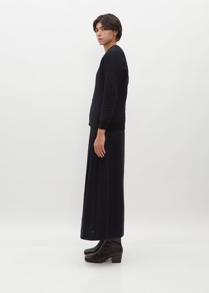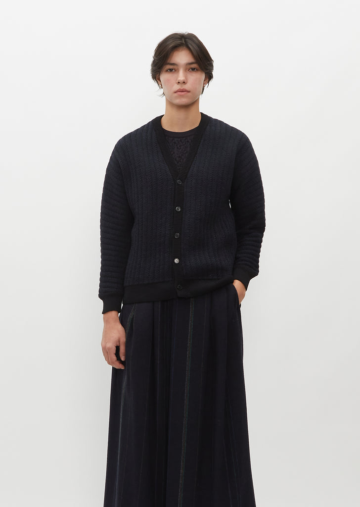 Stephan Schneider navy cardigan with seamless shoulder construction and bias cut center knit in a twill made of four different merino yarns in shades of navy, black and brown with the reverse side in cotton. Detailed with a v neckline, graphic vertical lines which add a quilted optic and texture and a solid black ribbed trim finished edges.