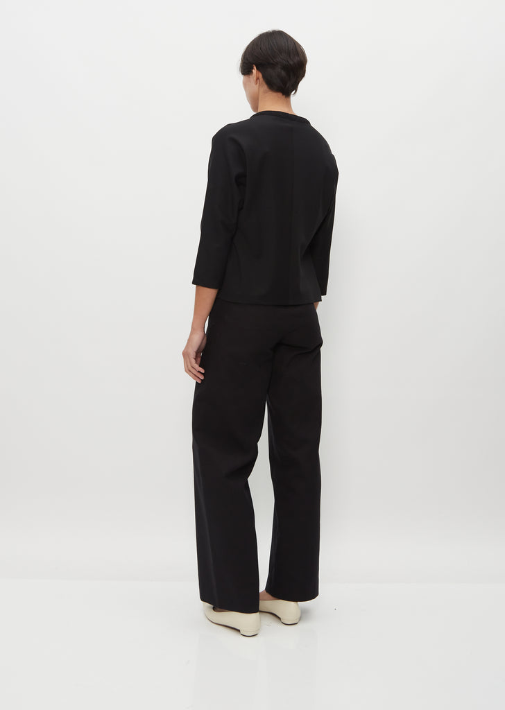 Stephan Schneider signature jersey top with a wool knit finish at neckline and three-quarter length sleeves in stretch cotton jersey. Straight, boxy silhouette with a relaxed fit.