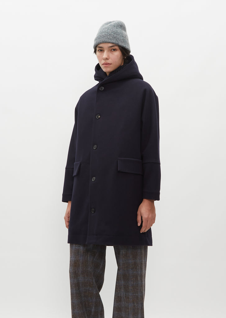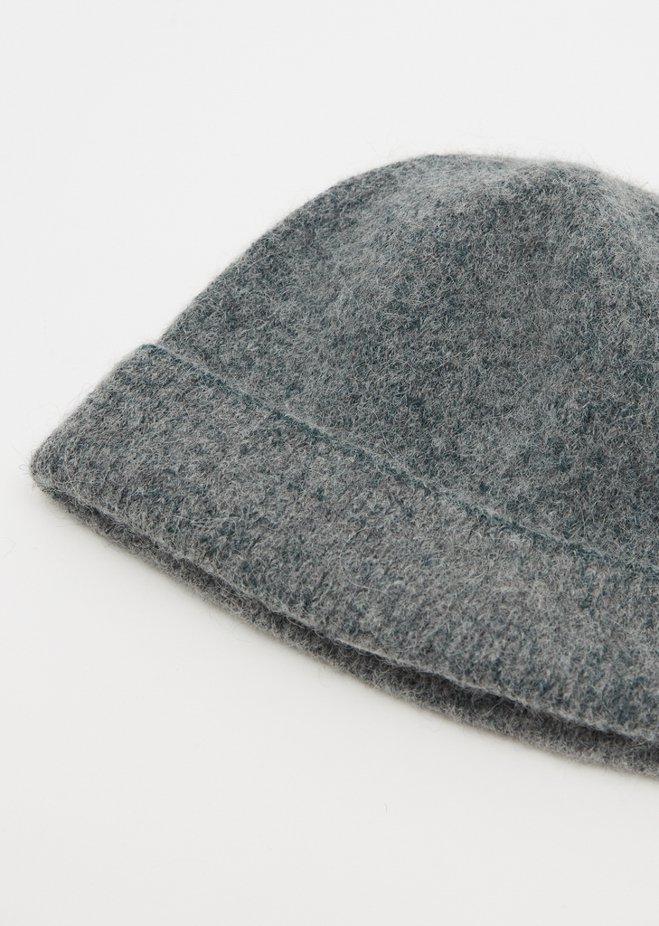 Stephan Schneider signature knit beanie with in light grey & forest blue hue mix in alpaca and merino wool. Can be worn with fold-over down.