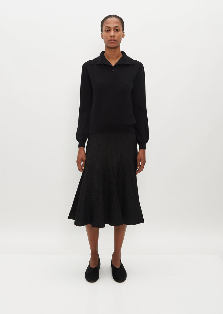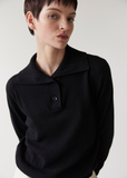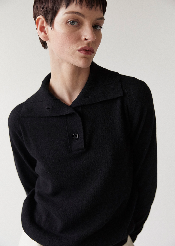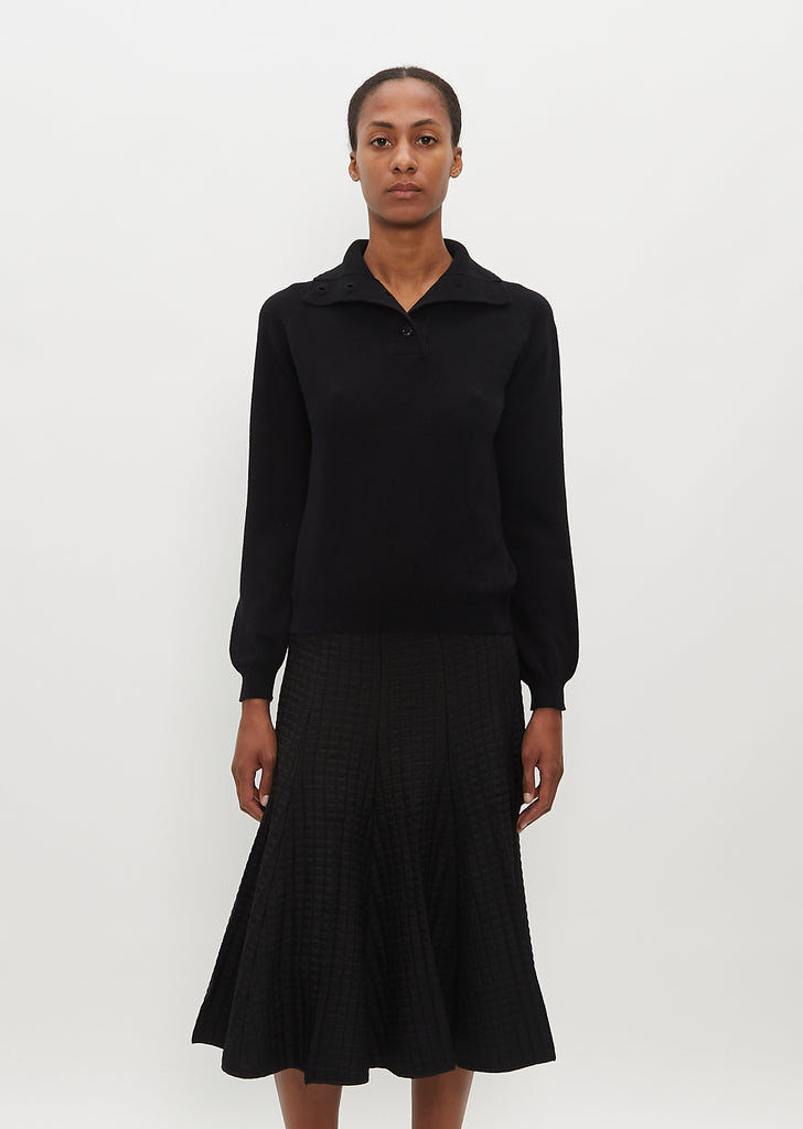 Ter et Bantine black sweater with a polo collar knit in pure wool. Features a three quarter placket with tonal buttons and ribbed trim finish along the collar, cuff and hem. Can alternatively be styled buttoned up for a turtle neckline.