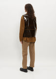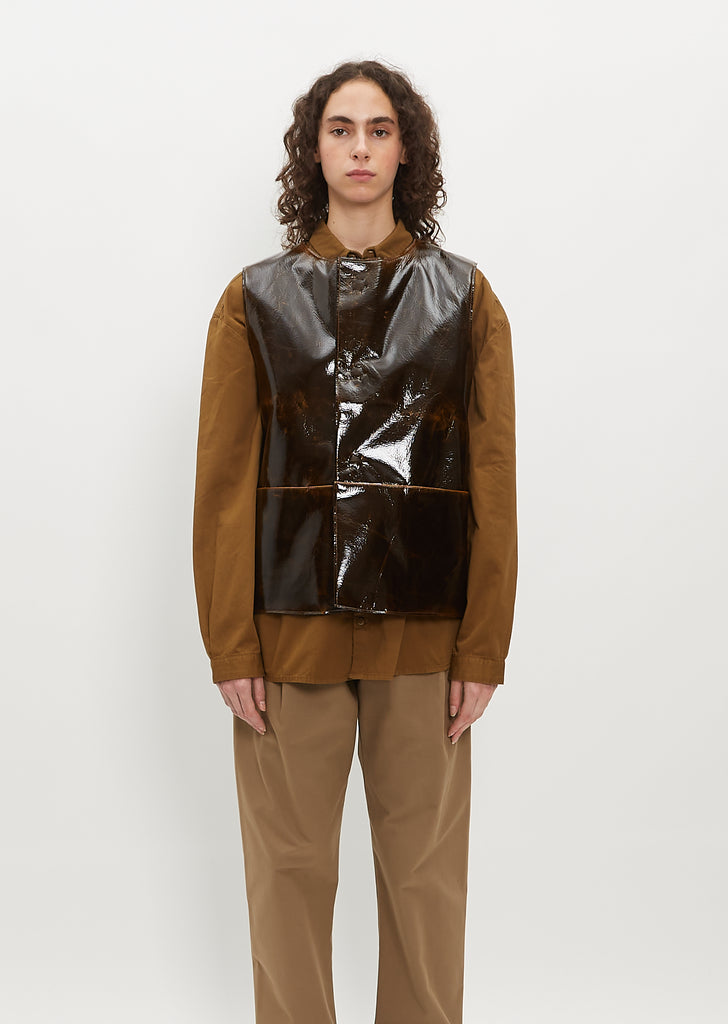 Toogood bronze collarless vest in water resistant high-shine resin coated wool. Features large snap buttons at the front and two welt pockets in the waist seam.