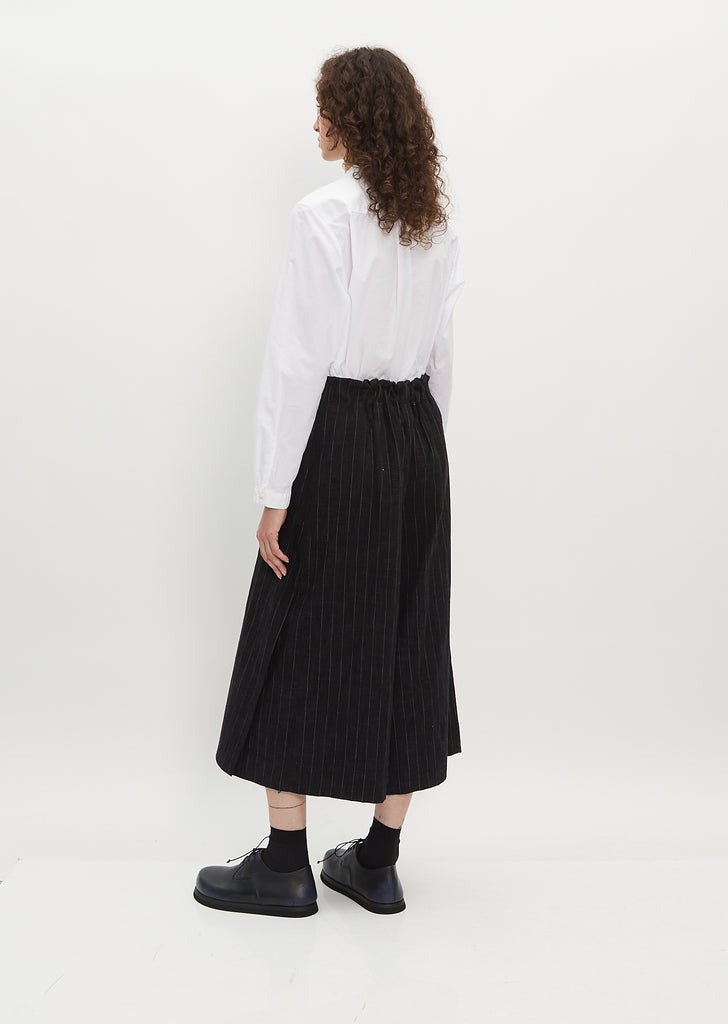 Toogood pinstripe flint grey cropped culotte trouser with the front appearance of a sophisticated skirt in a cotton wool blend. Features a front panel that sits subtly over the trouser base which drapes at the hip, hidden side pockets and elasticated waist.
