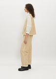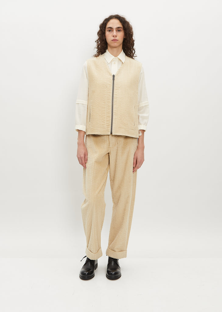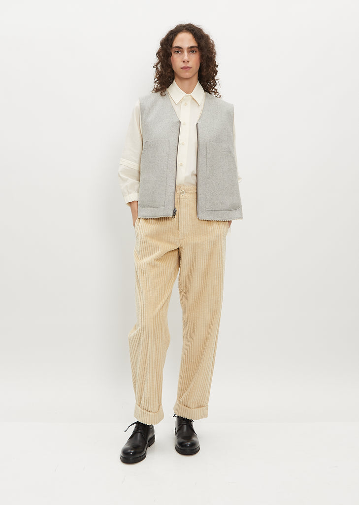 Toogood reversible gilet with one side crafted in textured cotton and the other in soft wool felt. Features a chunky zip fastening, patch pockets with snap nuttons and slit pockets.