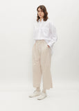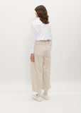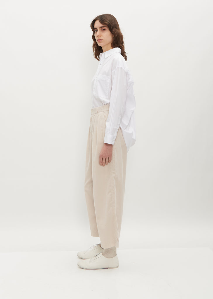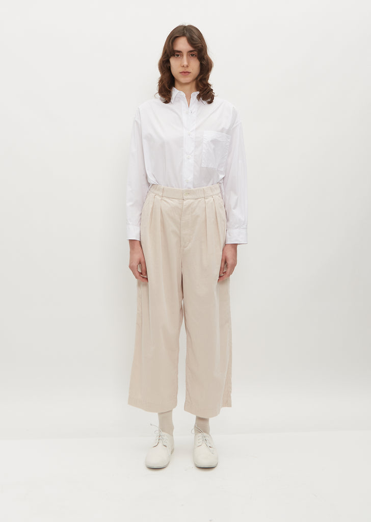 Toujours off white wide leg pants with a slightly cropped inseam crafted in garment dyed pima cotton corduroy. Detailed with two front pleats, angled side pockets, welt back pockets and a clean front waist band with elasticized back. Finished with a concealed button fly.