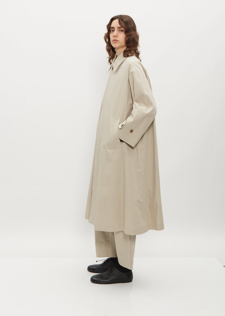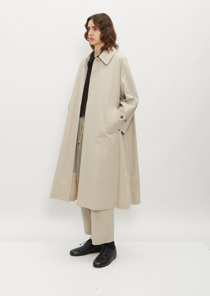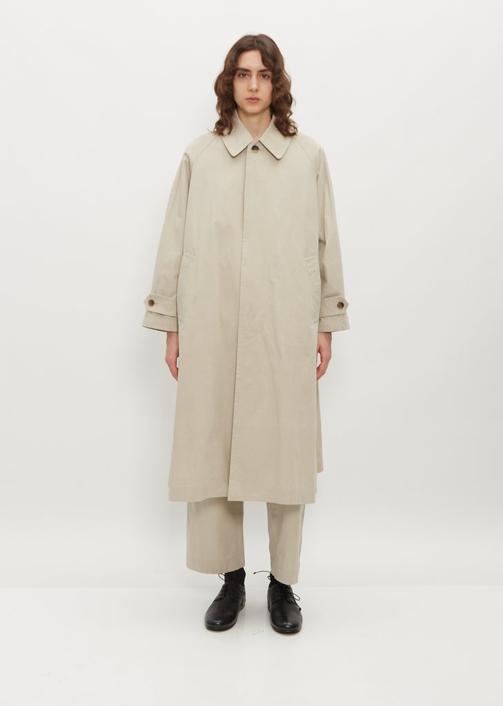 Toujours sand single breasted coat with a soutien collar crafted in high count cotton and silk gabardine. Features a spread collar with a concealed optional soutien button throat latch, raglan sleeves, welt seam side pockets and single back vent. Finished with dark brown horn buttons. Fully lined.