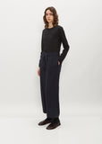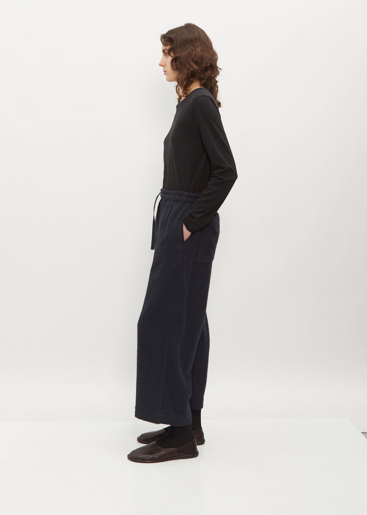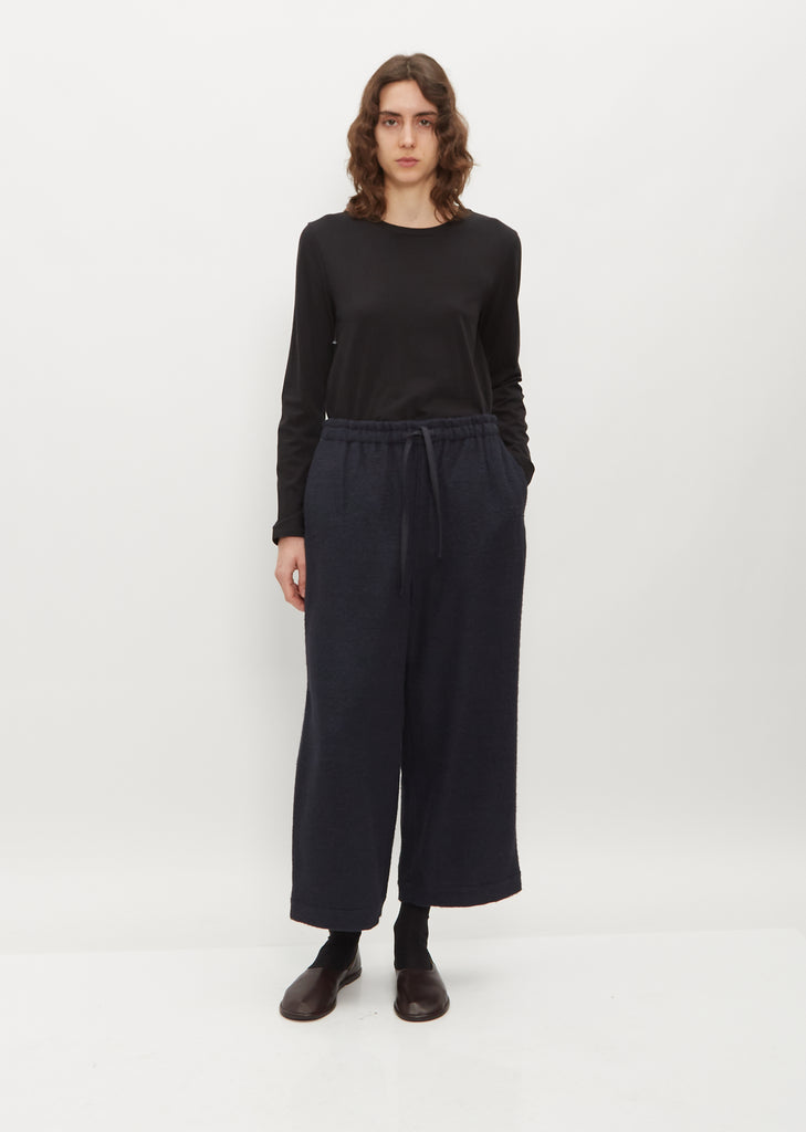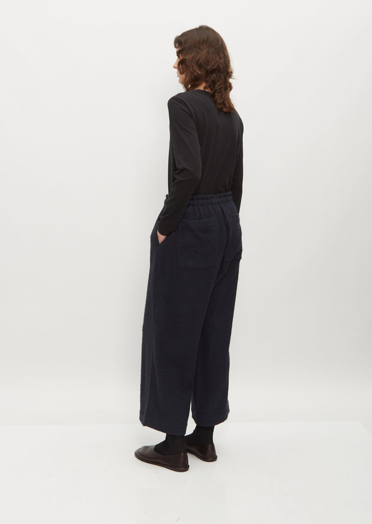 Toujours navy cropped, straight leg pant with an elasticized waist in silk mosser cloth. Features a front self tie drawcord in self, angled side pockets, and back patch pockets. Unlined. Pulls on.