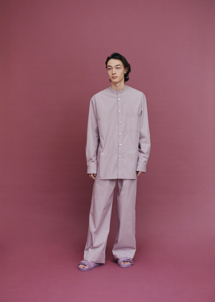 Birkenstock x Tekla — Unisex shirt with an oversized fit in tightly woven crisp organic cotton with a smooth, even finish, then lightly stonewashed for a soft hand feel. The extra-long yarns used prevent pilling and guarantee a deep, pure color even after years of use. Features a mini band collar, single chest patch pocket, straight hem and side splits. Finished with French seams and Mother of pearl buttons.