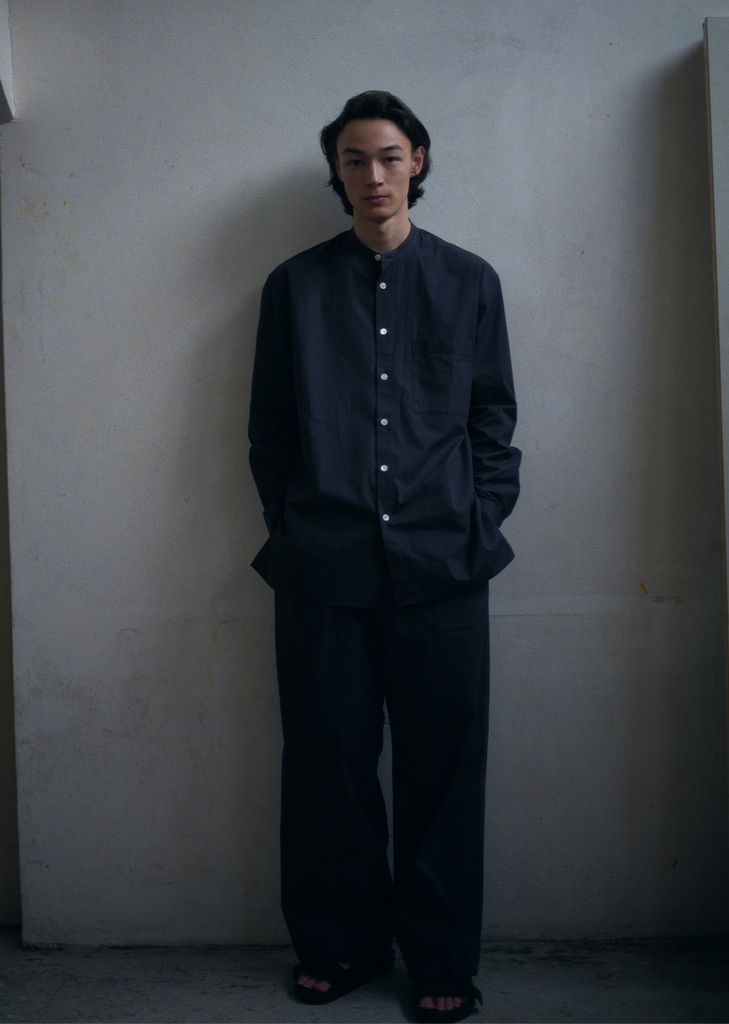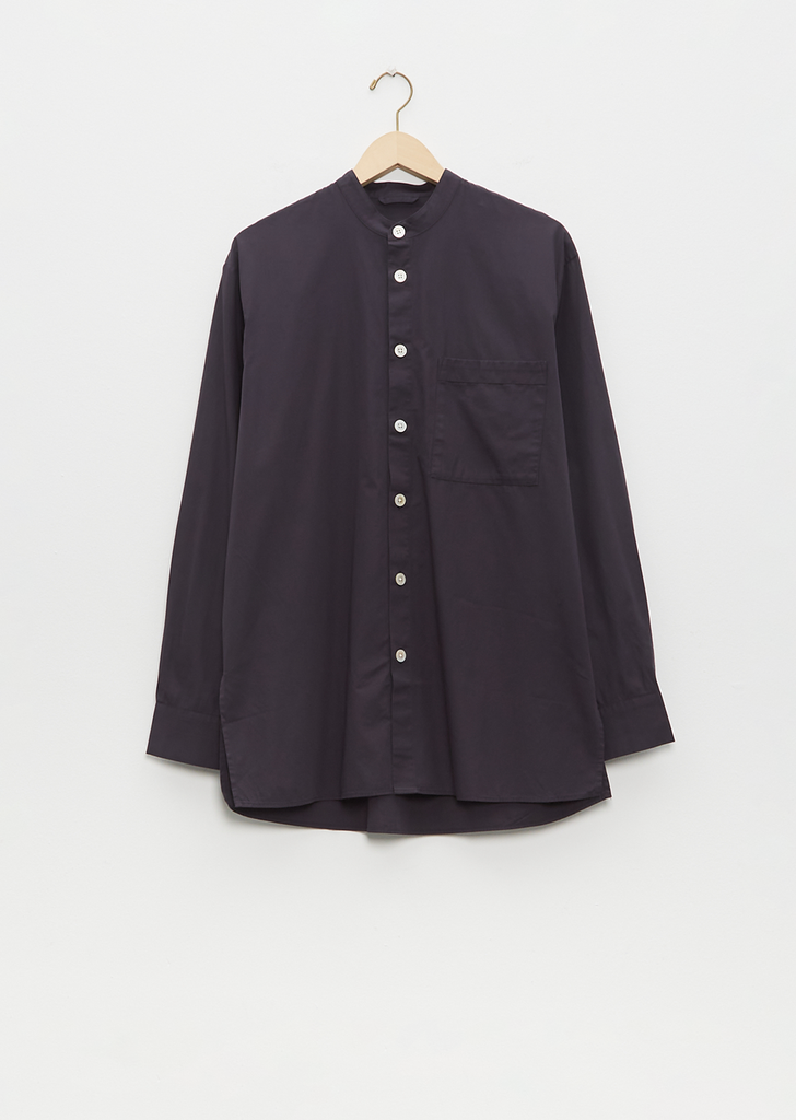 Birkenstock x Tekla — Unisex shirt with an oversized fit in tightly woven crisp organic cotton with a smooth, even finish, then lightly stonewashed for a soft hand feel. The extra-long yarns used prevent pilling and guarantee a deep, pure color even after years of use. Features a mini band collar, single chest patch pocket, straight hem and side splits. Finished with French seams and Mother of pearl buttons.