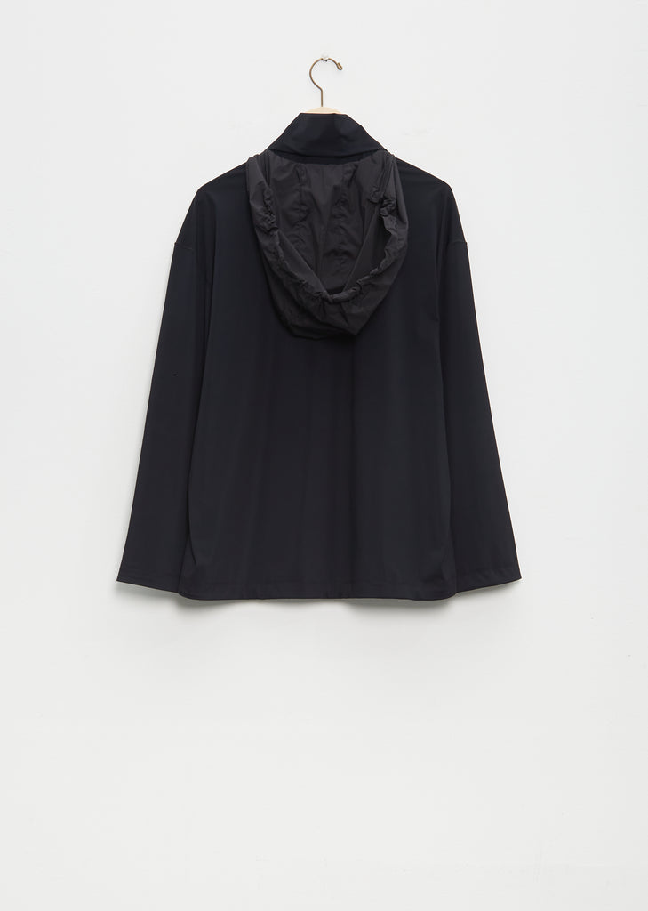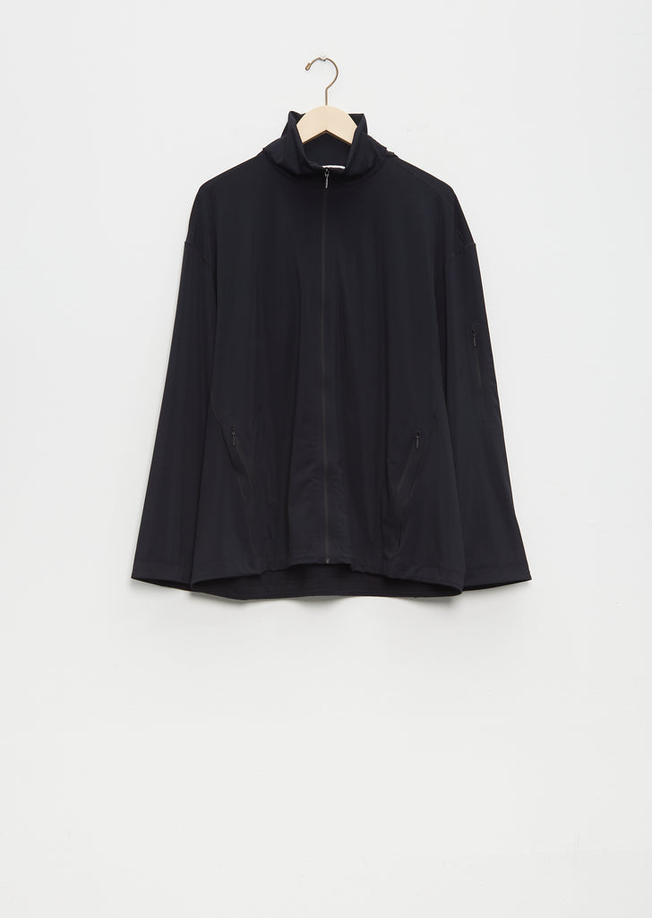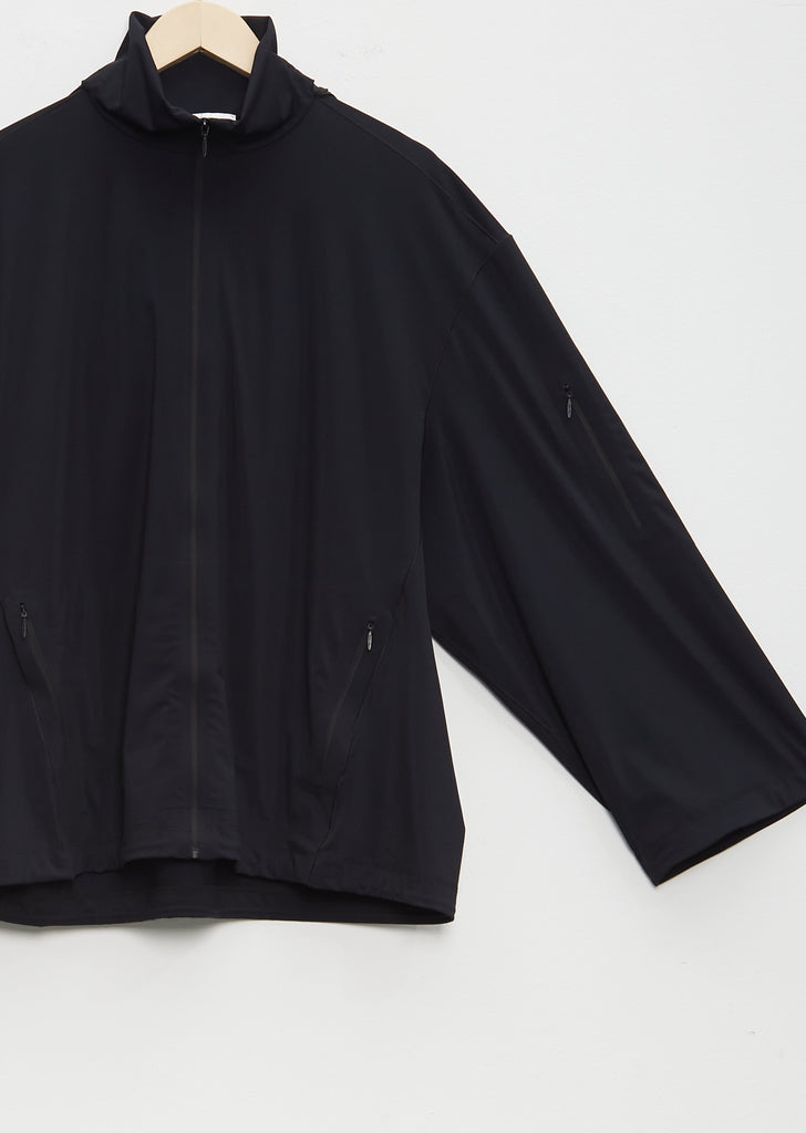 The Row black long sleeved zip-up jacket with a stand collar in smooth stretch jersey with roll-up hood, side zipped pockets, and adjustable elastic sleeves and waistband. Finished with tonal drawcord toggles on hood and upper sleeve tonal zip pocket.