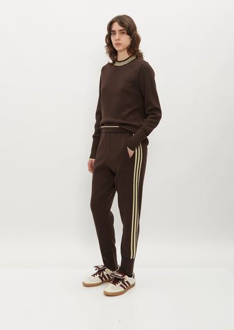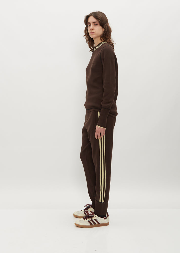 Wales Bonner x Adidas dark brown tapered leg knit sweat pant with an elasticized waist in a recycled polyester and merino wool blend. Features concealed side zip pockets, three stripe branding along sides and waistband with an interior drawcord and cinched cuffs. Pull on fit.