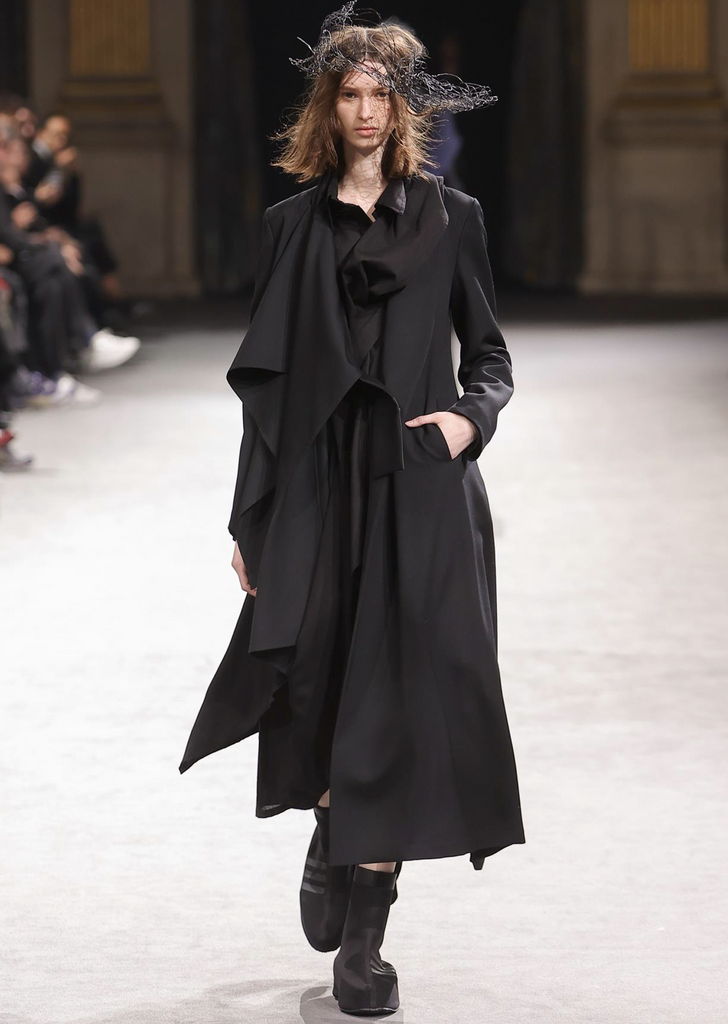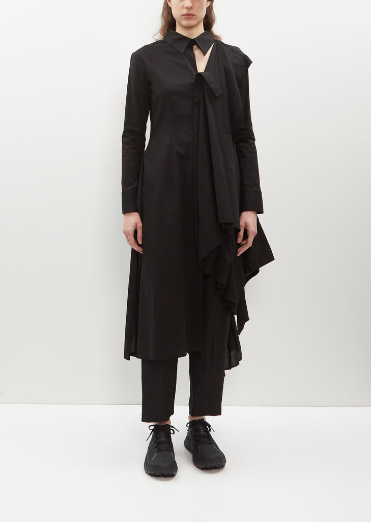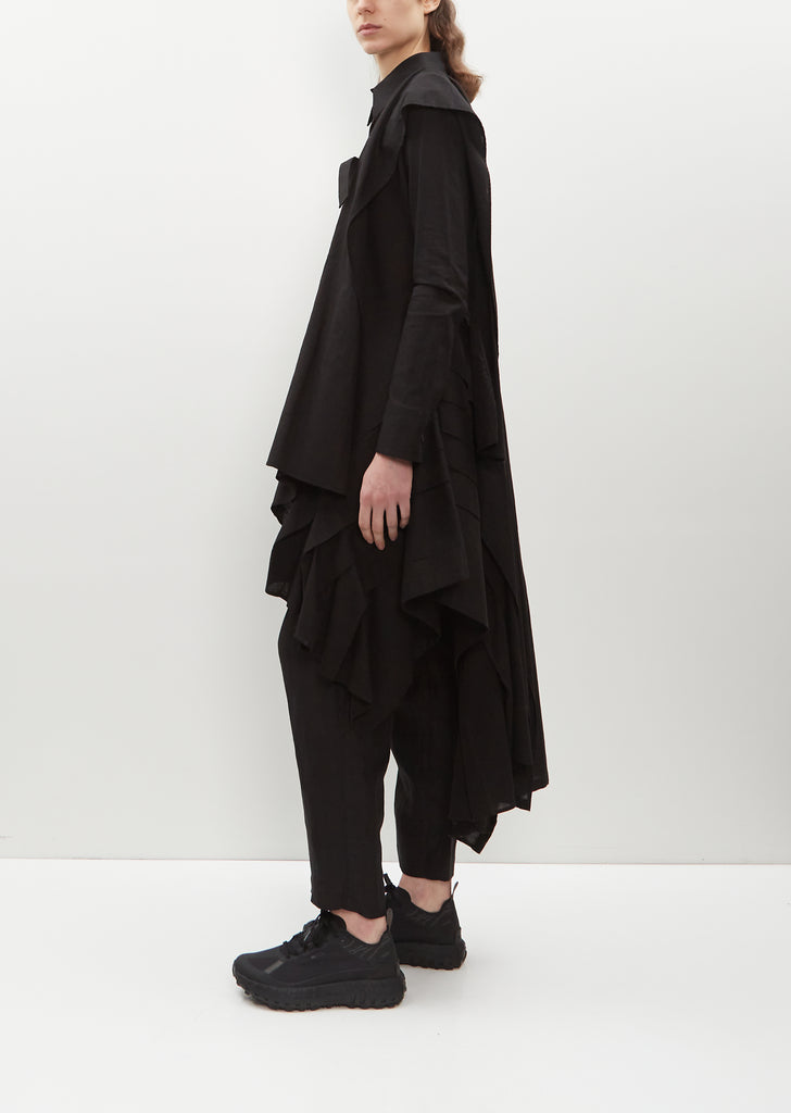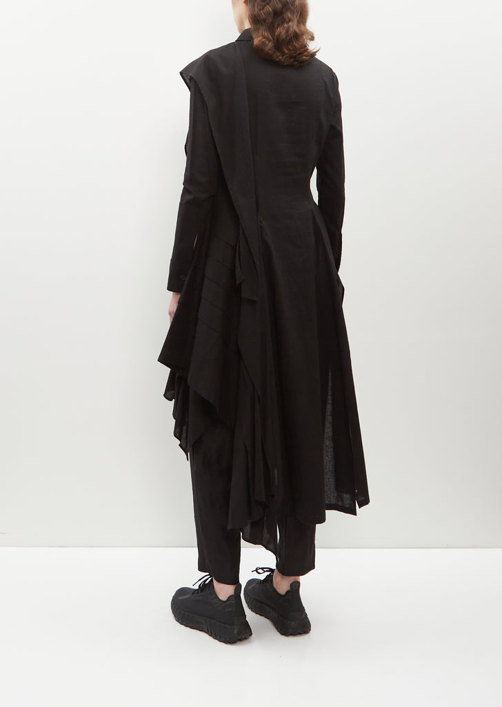 Yohji Yamamoto black fitted long jacket with single pleated side and asymmetric hem in cotton linen muslin. Features a point collar with single button closure at neck, draped concealed placket exposing collarbone on one side and a draped panel on the right side of the placket which drapes over the back of the shoulder as well. This dress is unlined.