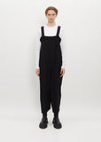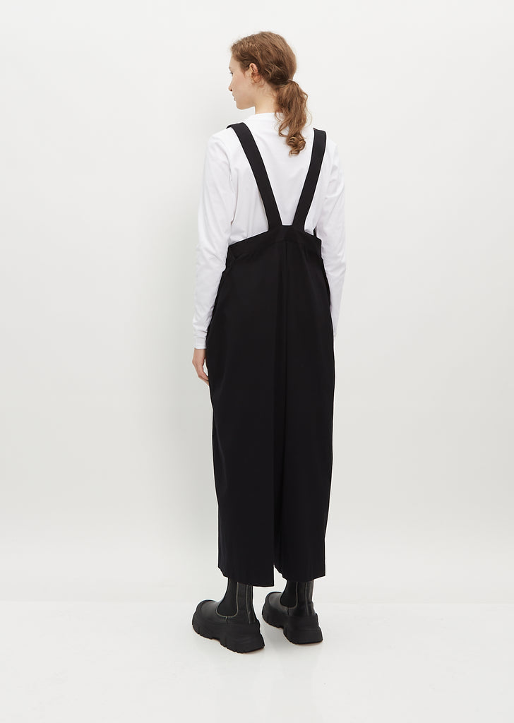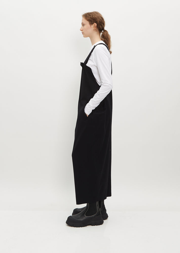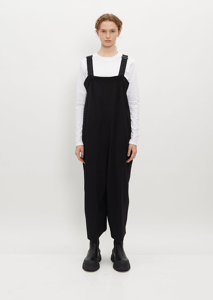 Y's by Yohji Yamamoto black jumpsuit with a cropped wide leg pant in a wool blend. Features a square neckline, pin tucks at either side at top of bib, welt side pockets and single button overlap closures at either side.