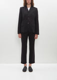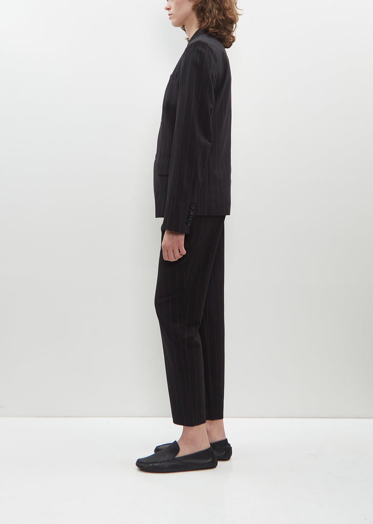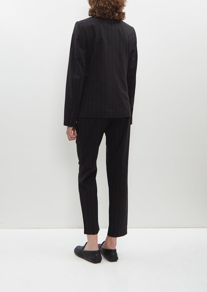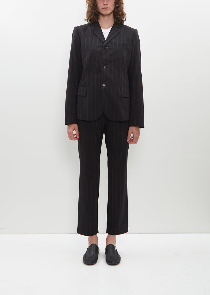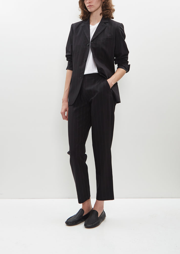 6397 black pinstripe single-breasted blazer with small notch lapels in lightweight wool blend twill. Features a single chest welt pocket, two flap pockets at front, buttoned cuffs and a three buttons closure at front. Fully lined in tonal satin fabric.