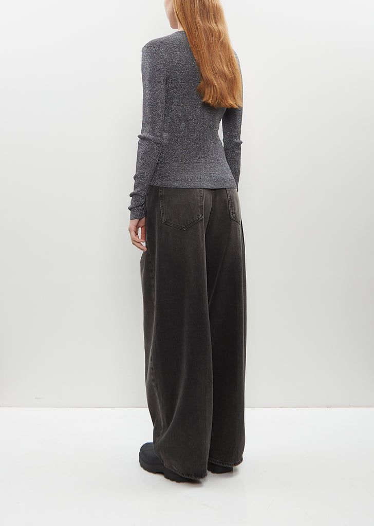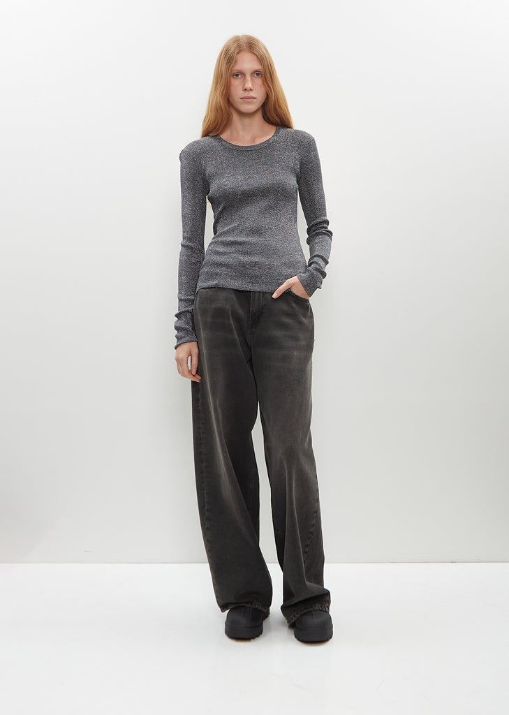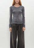 6397 dark silver long sleeve crewneck tee in cotton and nylon blend ribbed knit with metallic thread. Closer fit.