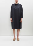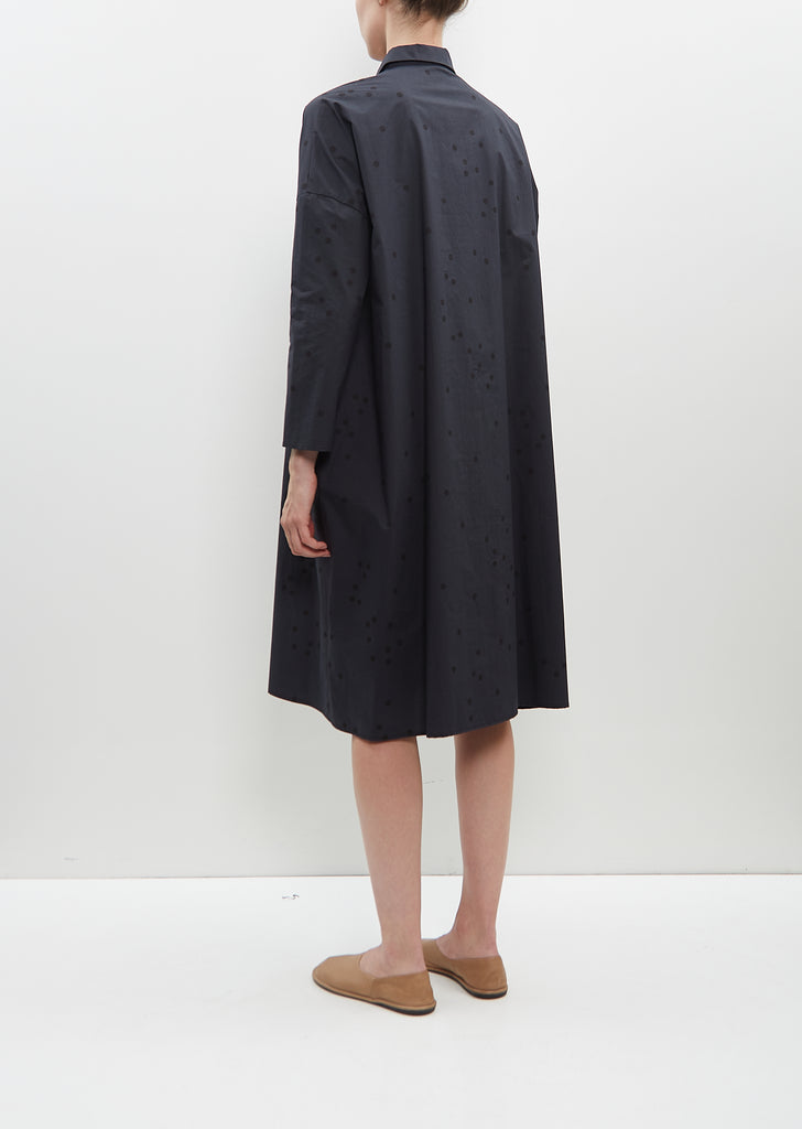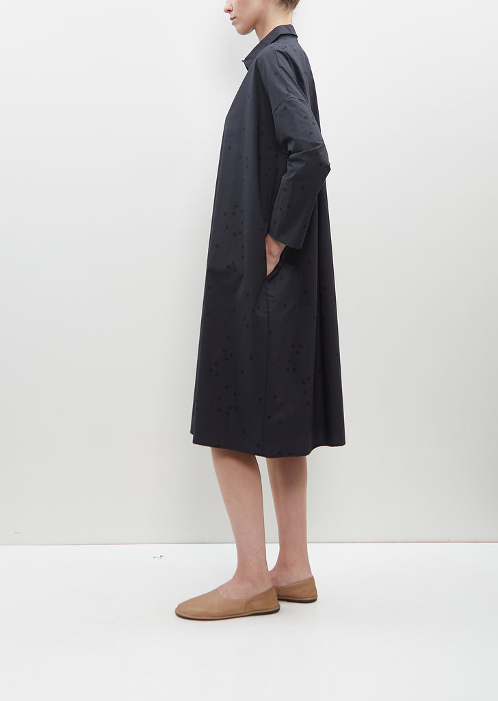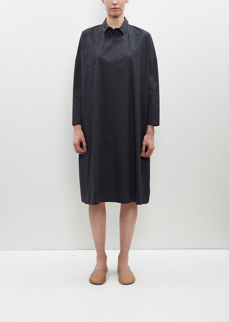Apuntob anthracite grey printed long sleeve shirtdress with a spread collar and a three button closure at front in cotton poplin. Features a single patch pocket at chest and side seam pockets. Finished with tonal fabric covered shank buttons. Relaxed fit.
