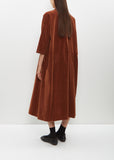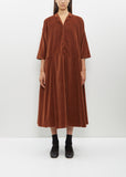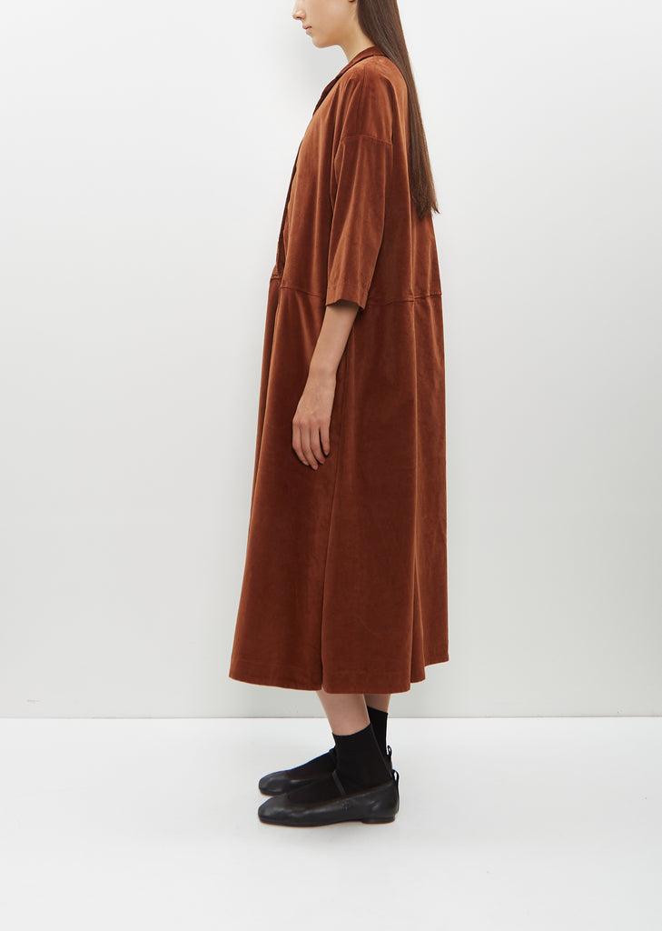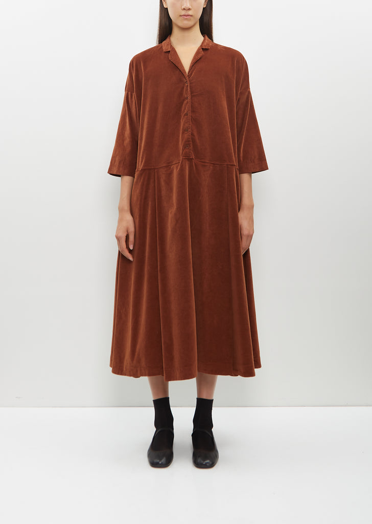 Album di Famiglia shirt dress with a pleated skirt and half sleeves in rust stretch cotton velvet. Features mini notched lapels, side seam pockets, dropped shoulders and a half placket with buttons closure. Comes unlined.
