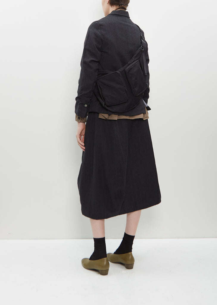 Amiacalva black bodybag in technical fabric. Features two-way zip-top closure, two zip-around patch pockets at face, adjustable and detachable shoulder strap with slide buckles, large interior slip pocket with velcro closure, and two small interior slip pockets.